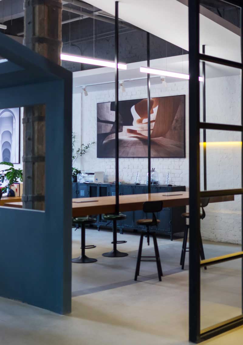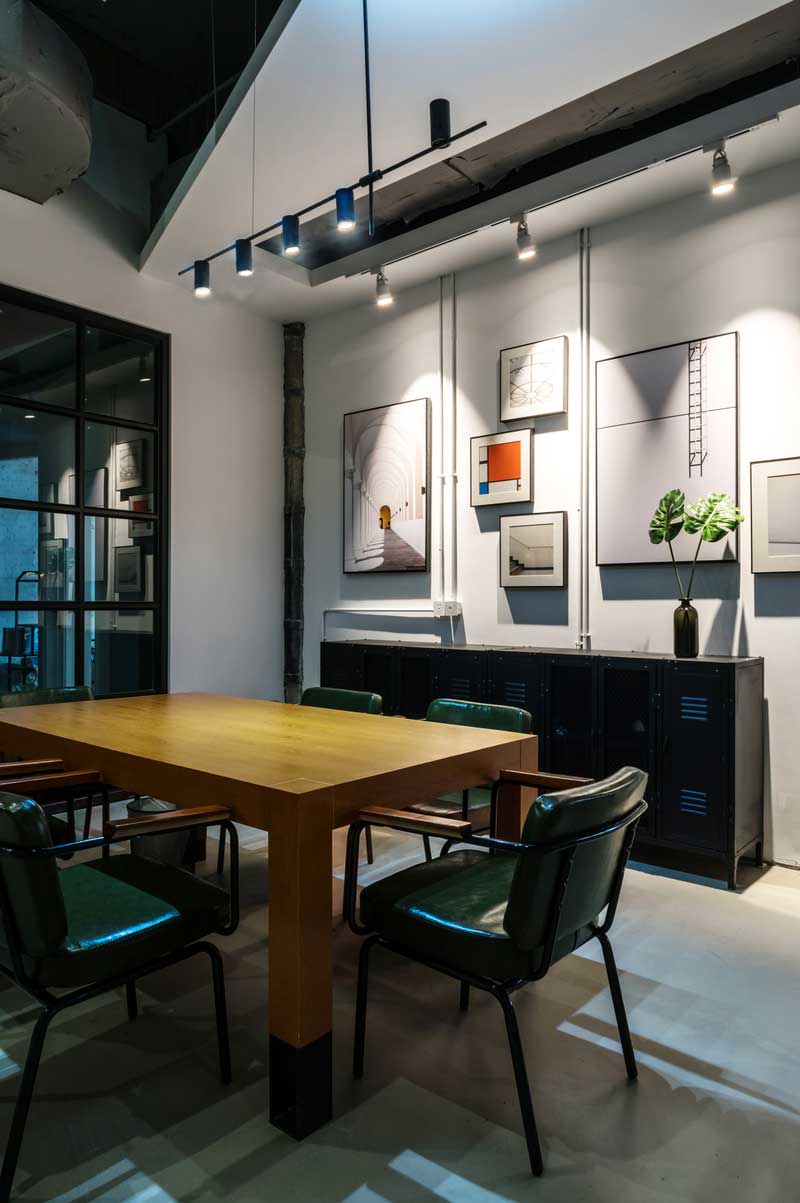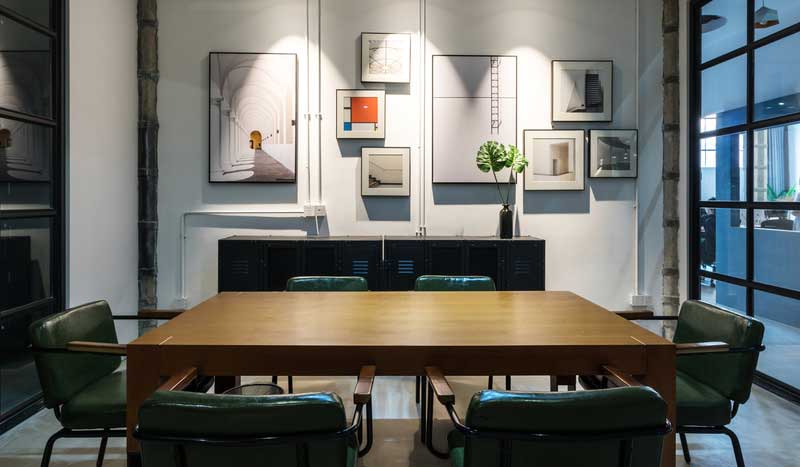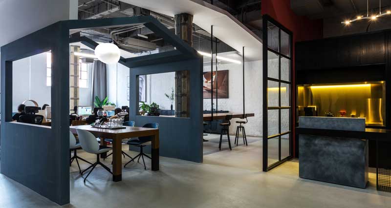 這里沒有冰冷刻板的接待臺和問詢處,取而代之的是平等開放的辦公區和家一樣的共享休息區。設計師尊重原有建筑物的特點,來做了整個空間的布局。利用了屋中屋的方式,讓整個空間有獨立的功能,又隔而不斷。主要的材料就是石膏板和玻璃隔斷隔墻,低碳又經濟。