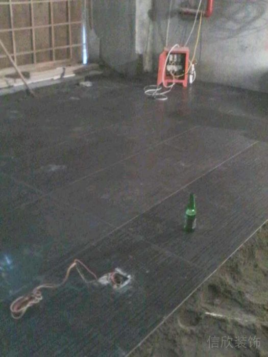 7月19日,開始鋪地磚了。信欣深圳裝修公司工地進程,本次餐廳裝修選擇了深灰色條紋的仿古磚