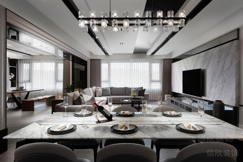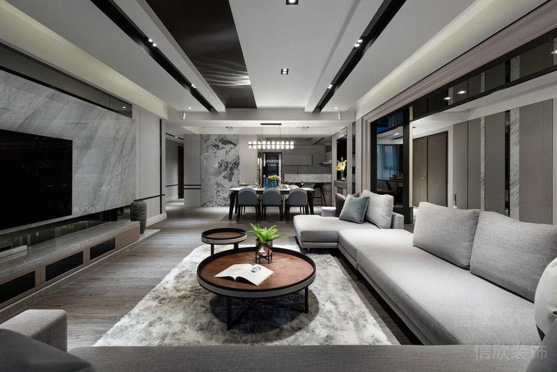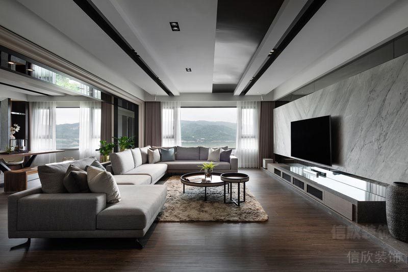 深圳市寶安區會展灣水岸客廳 步入客廳一眼望去是一面天然大理石的電視背景墻奢華感極強,配上布藝沙發,加黑色金屬線條裝飾的簡約吊頂,中性色的木紋地板;頓時讓人一掃疲憊,身心愉悅。