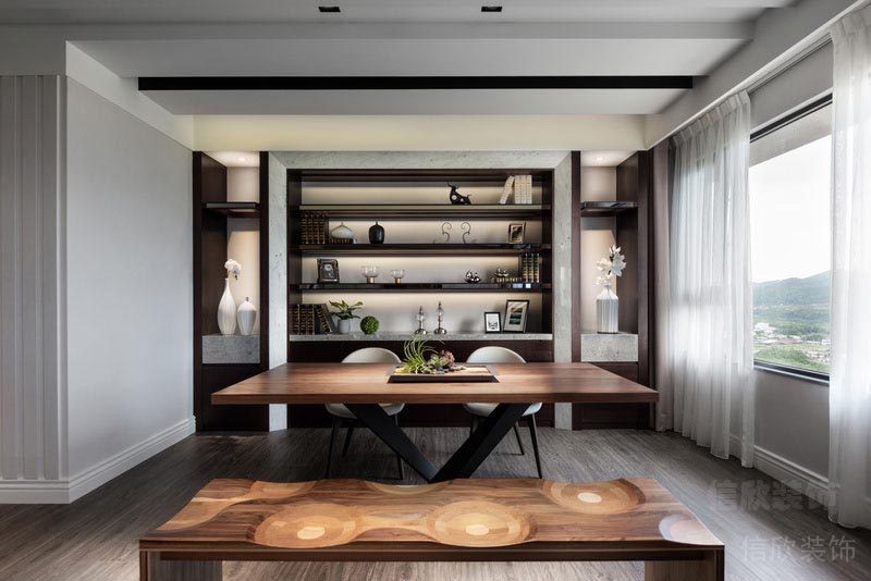 深圳市寶安區會展灣水岸餐廳 餐廳和客廳一體式的做法,是現代裝修設計者常用的一種手法,兼具了實用性和裝飾性的特點,天然的大理石餐桌,配上工業風吊頂和抽象的繪畫,濃厚的文藝風。