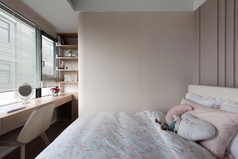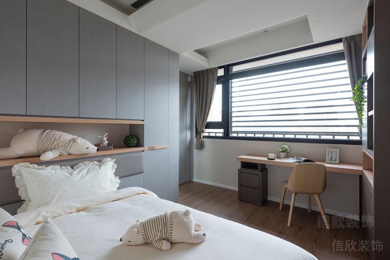 深圳市會展灣水岸兒童房 兒童房選擇光線和采光都非常好的一間房子,可以看出父母對孩子滿滿的愛和希望,暖黃的壁紙配上北歐風的一體式衣柜和書柜,深色的木紋地板;滿足了實用的特點,不會順著孩子年齡的長大而過時,永遠都有那份家的驚喜在為你守候。
