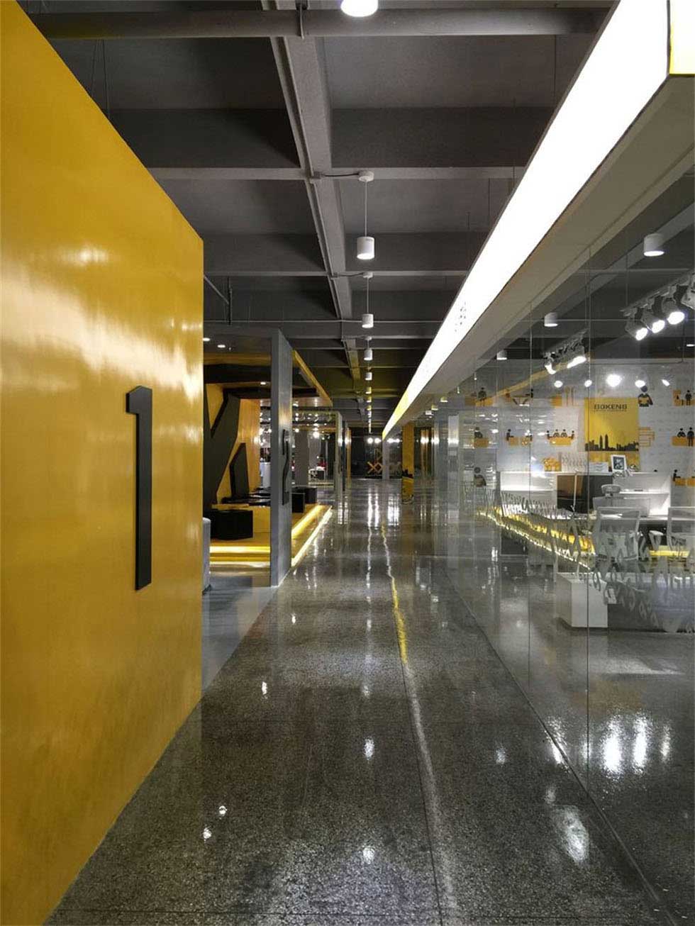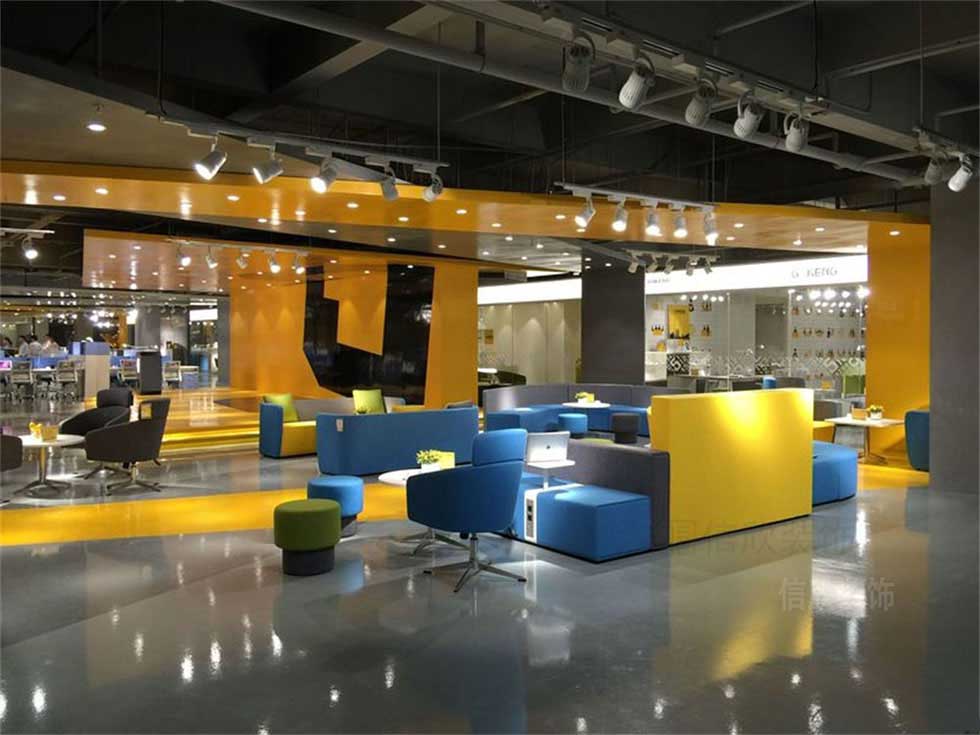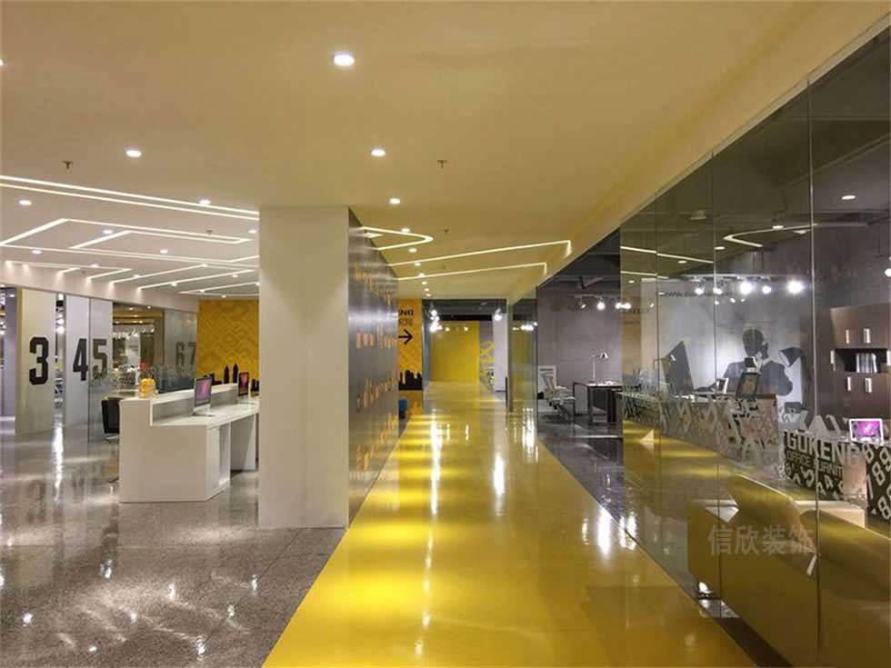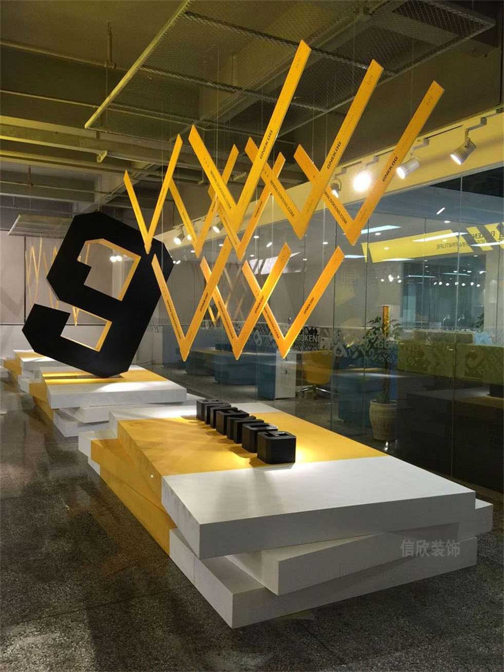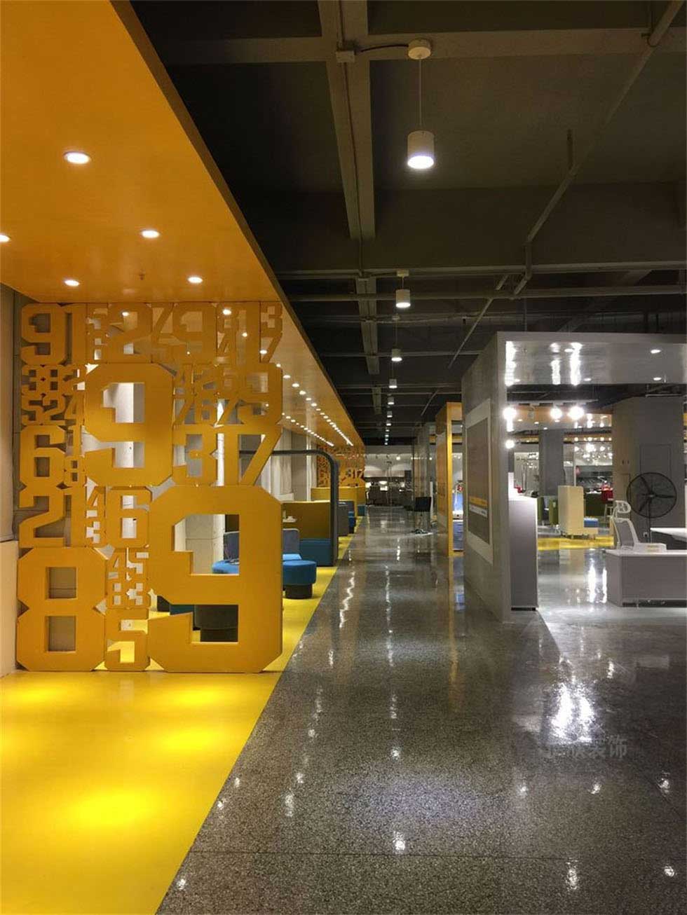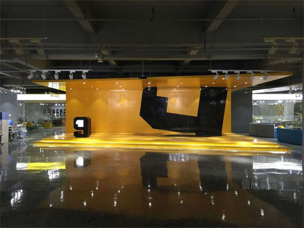 橙黃色的兩層地臺加高,并加上時尚的燈條設(shè)計,黃色和黑色不規(guī)則圖形的設(shè)計,墻頂面一體式的空間分離方式,創(chuàng)造出一個既可以做展臺,又能作為活動舞臺的小區(qū)域。