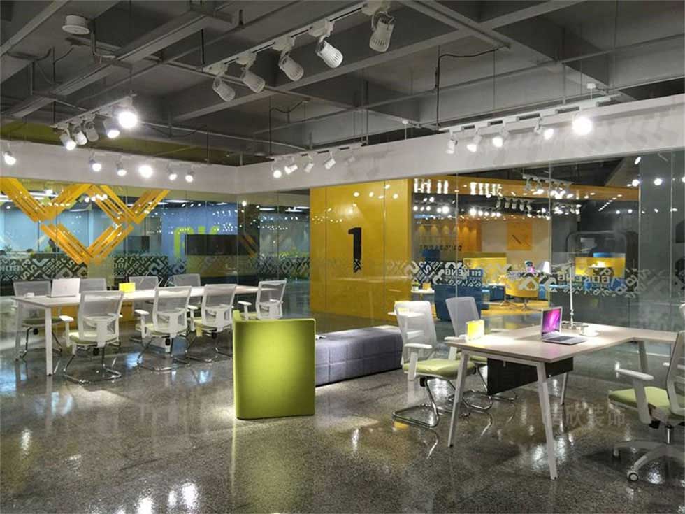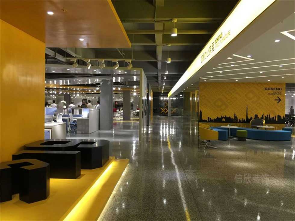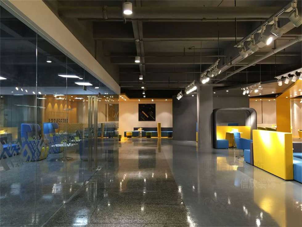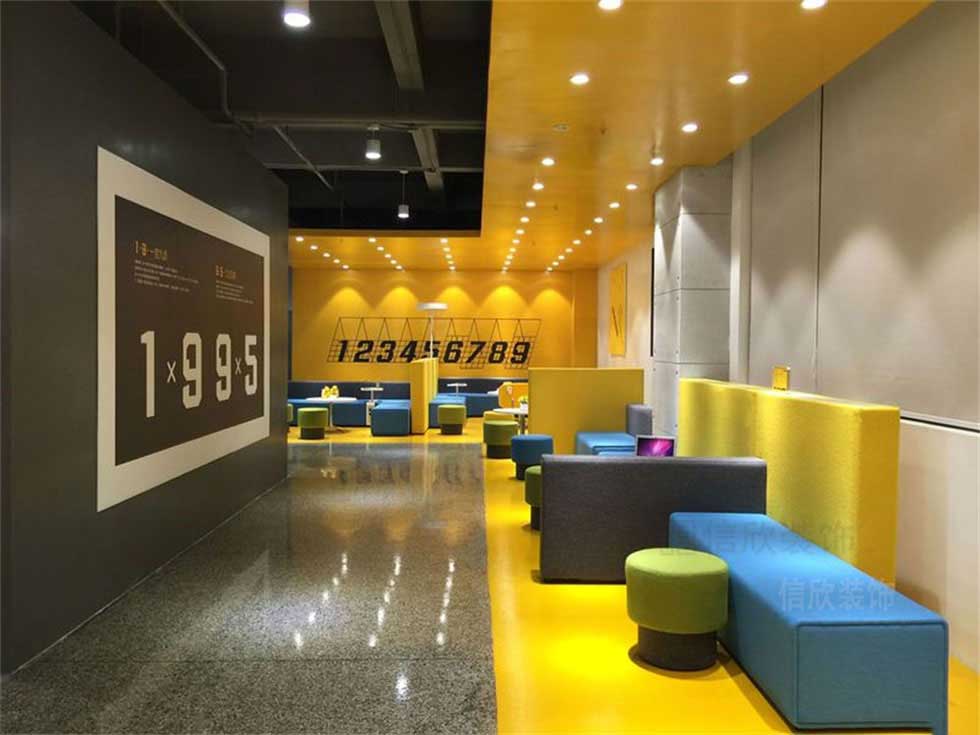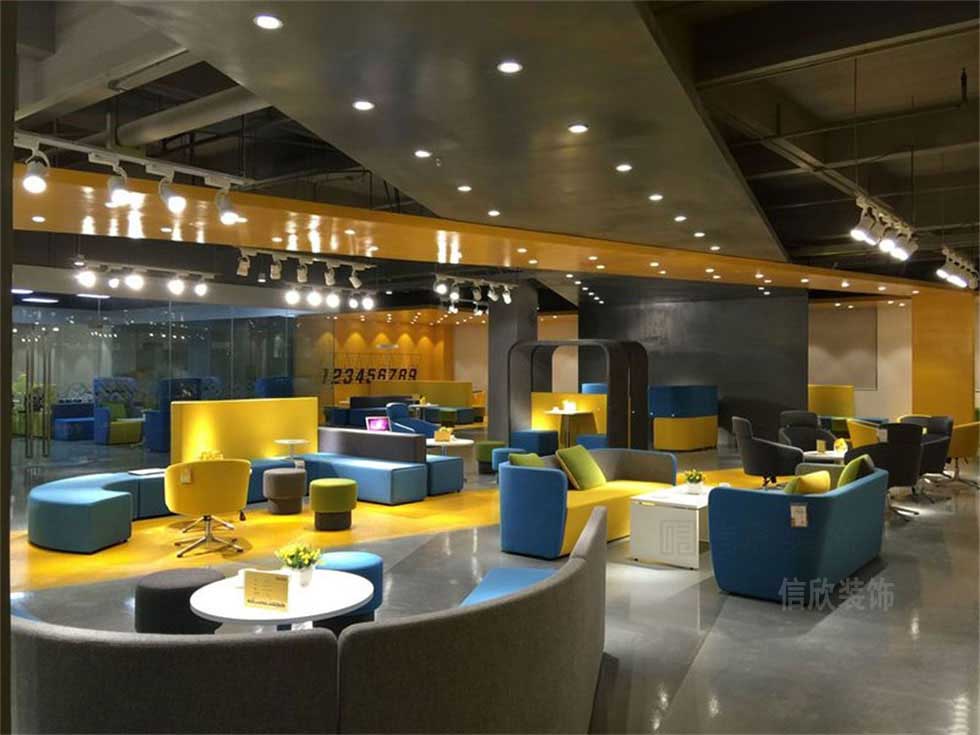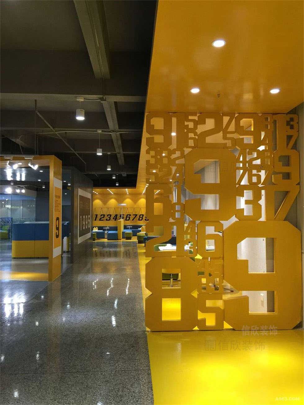橘黃的地面和橙黃色的頂面,用了充滿現(xiàn)代時尚元素的,數(shù)字藝術(shù)隔斷,和頂面的小射燈,讓卡座洽談區(qū),和冷峻的工業(yè)感頂面,能夠融為一體而不互相沖突,滿足工業(yè)風的現(xiàn)代美感。