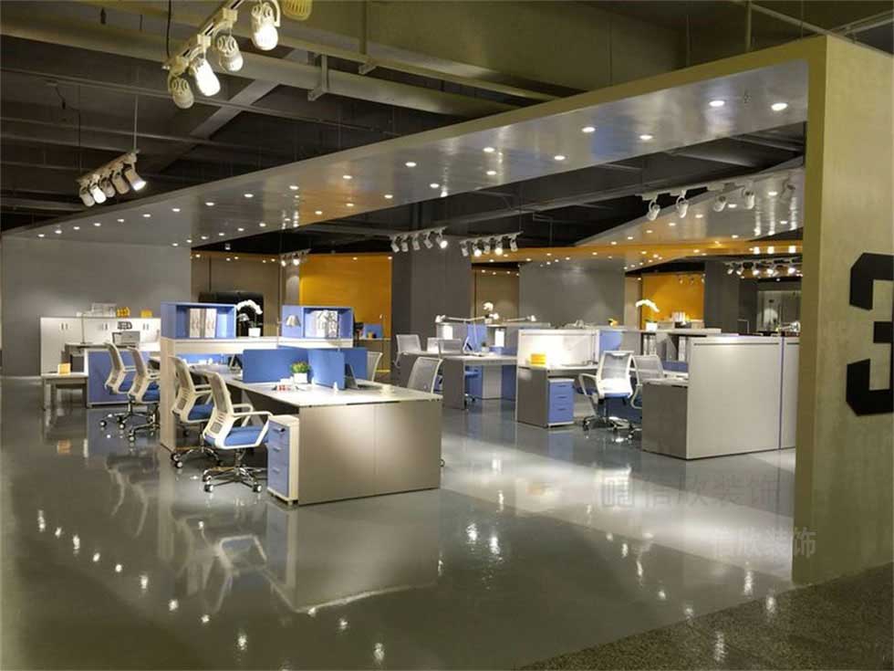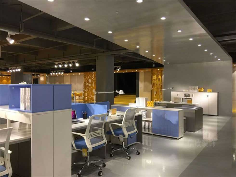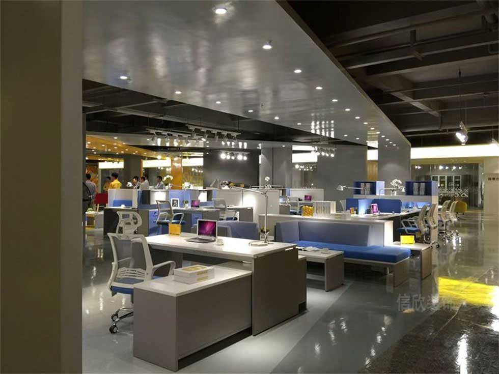 辦公室展區(qū),用淺灰色的地面,區(qū)分于外面的過道,工業(yè)感的設(shè)計,灰色石膏板獨立的頂面,使的更高空間和現(xiàn)實的辦公場所更接近,更有真實感,方便客戶的選購。