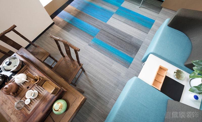 深圳市南山區辦公室會客區 藍色漸變藝術玻璃、橙色織物、黑鋼與原木陳設,在空間中形成鮮明的對比和碰撞,使空間富有活力,讓不同年輪的物件產生對話……