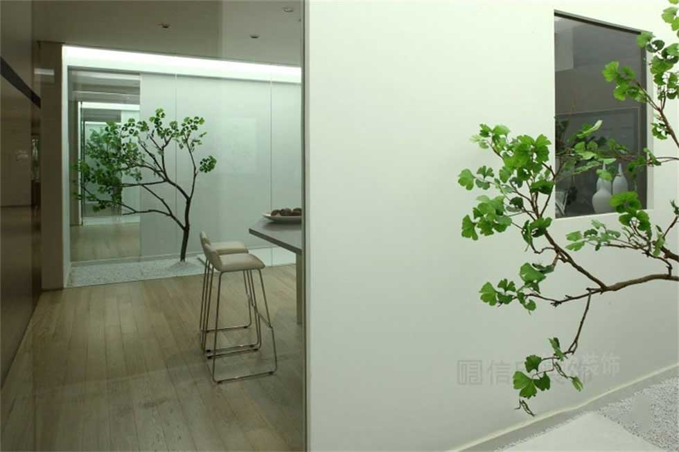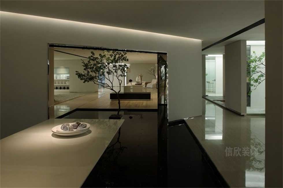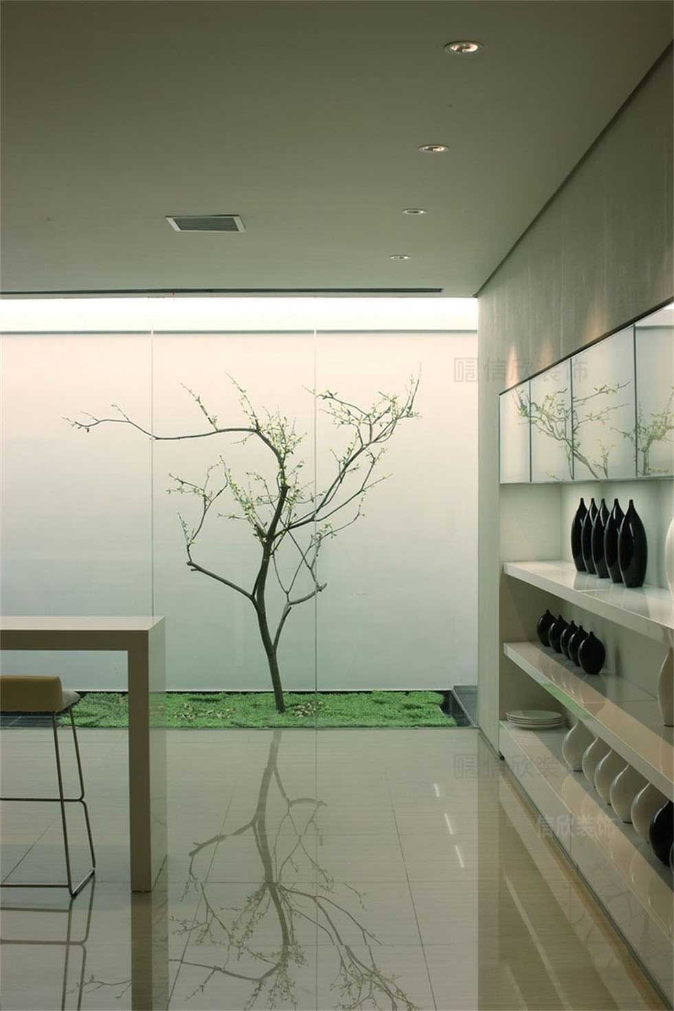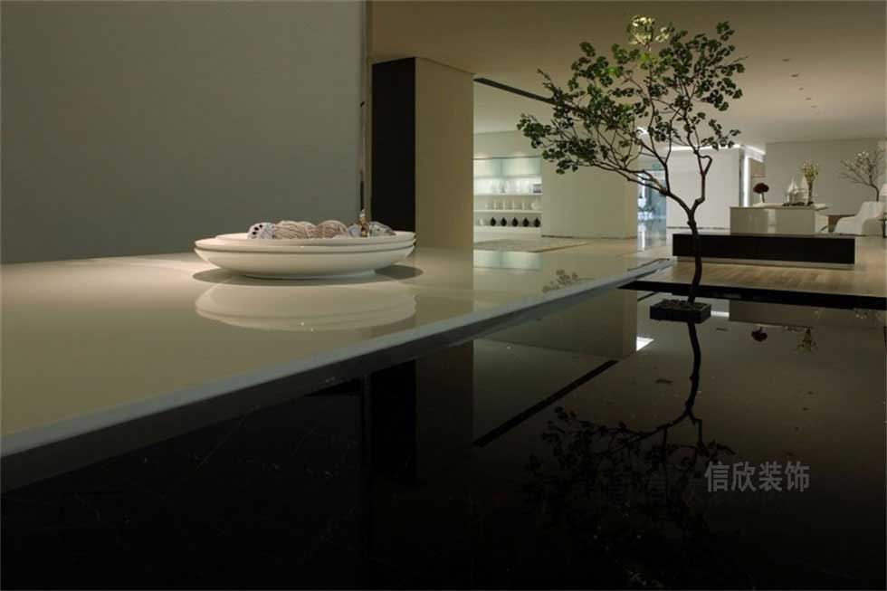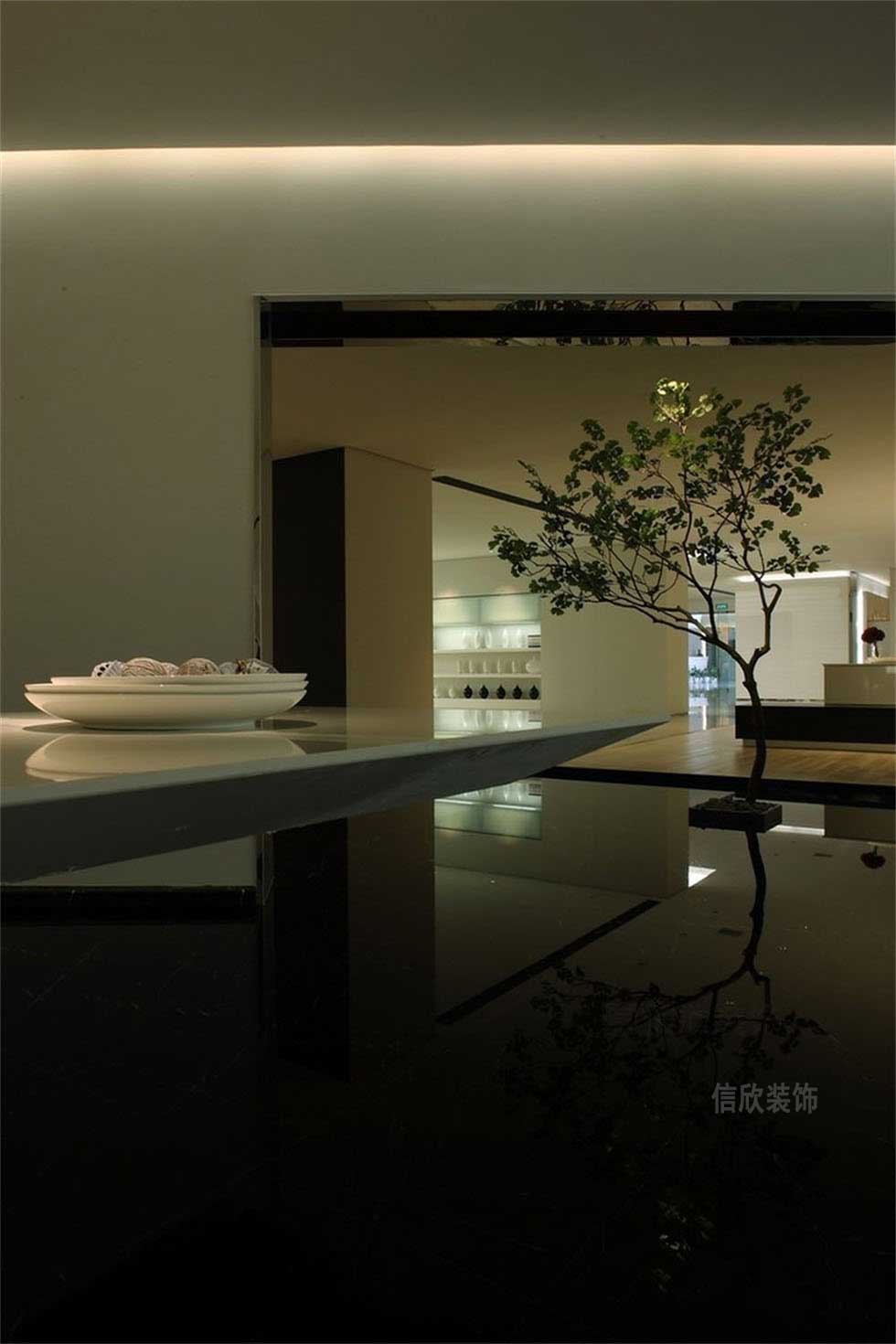 黑色的地磚作為區(qū)域的劃分,下降的地臺做法,搭配盆景的設(shè)計(jì),在房間里營造出枯山水的精致,高拋的黑色地磚,高光的反射度,讓人沉醉于亦真亦幻的夢境里。