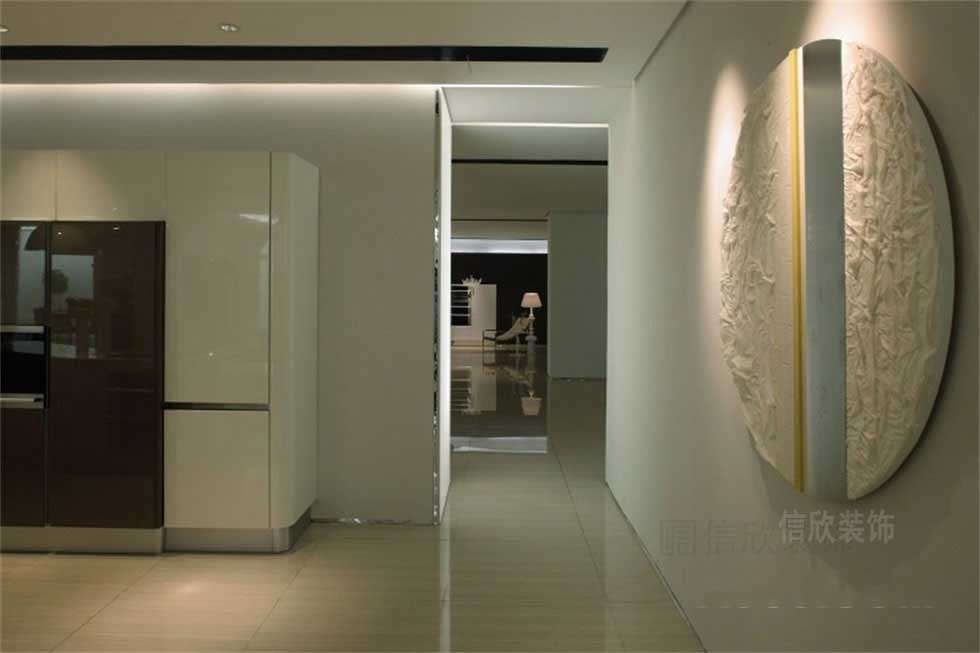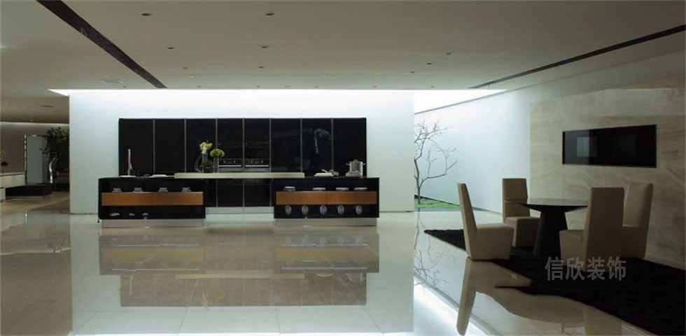 素雅的米色地面,符合現(xiàn)代人的審美特點(diǎn),玻璃材質(zhì)的壁柜,簡約中富有時(shí)尚高檔的氣質(zhì),黑色和白色結(jié)合的中島柜,兩邊做碗筷柜,中空隔板早餐臺的設(shè)計(jì)模式,新穎使用功能性強(qiáng)。