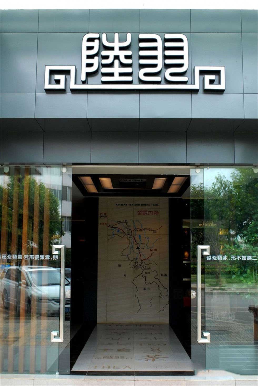 茶葉文化展廳外立面的裝修設(shè)計(jì),采用符合中華文化的灰黑色為主題,小篆書寫的LOGO一眼望去營造一種文化的氛圍,用磨砂玻璃制作的頂棚,上面加上了體現(xiàn)中式文化的書法。