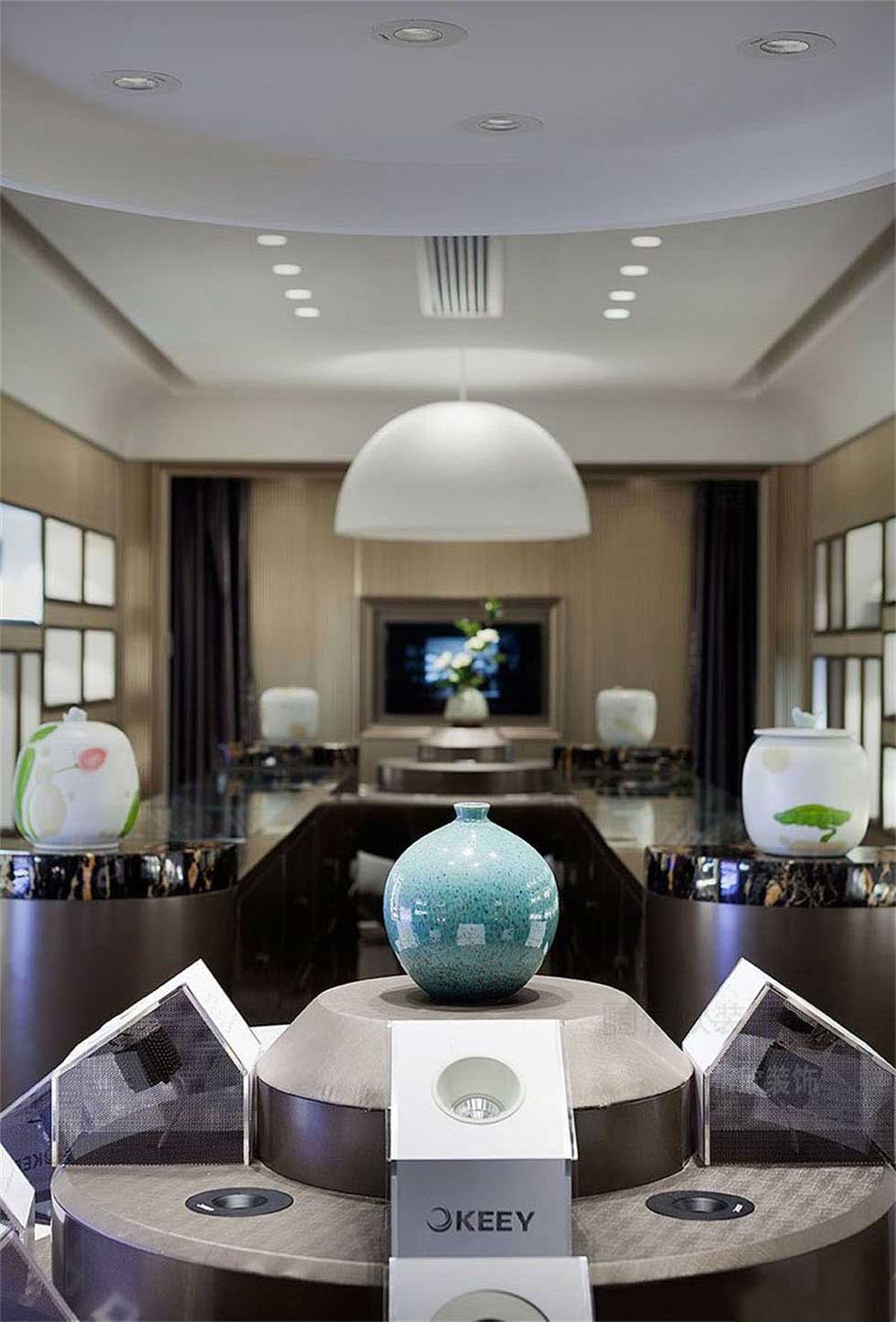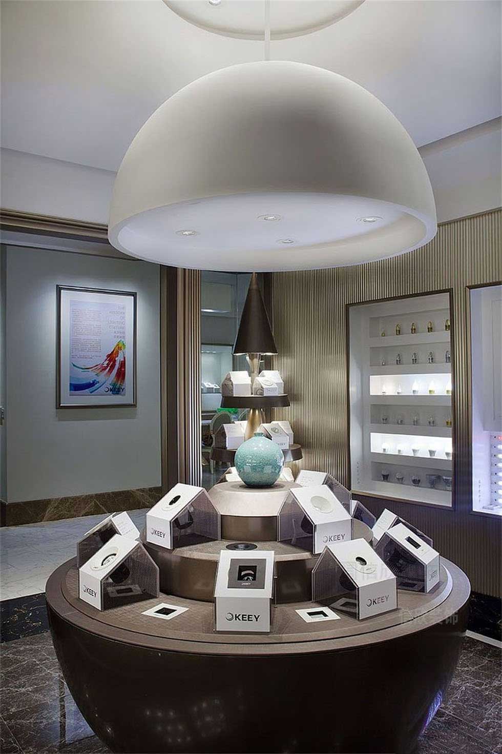 白色的頂面頂燈,對應深色石材紋理的地磚和三層層次感分明的展臺,既可以作為燈具的展示操作,又是一個洽談的小圓桌,把現代科技感和時尚美觀相結合的設計方式。