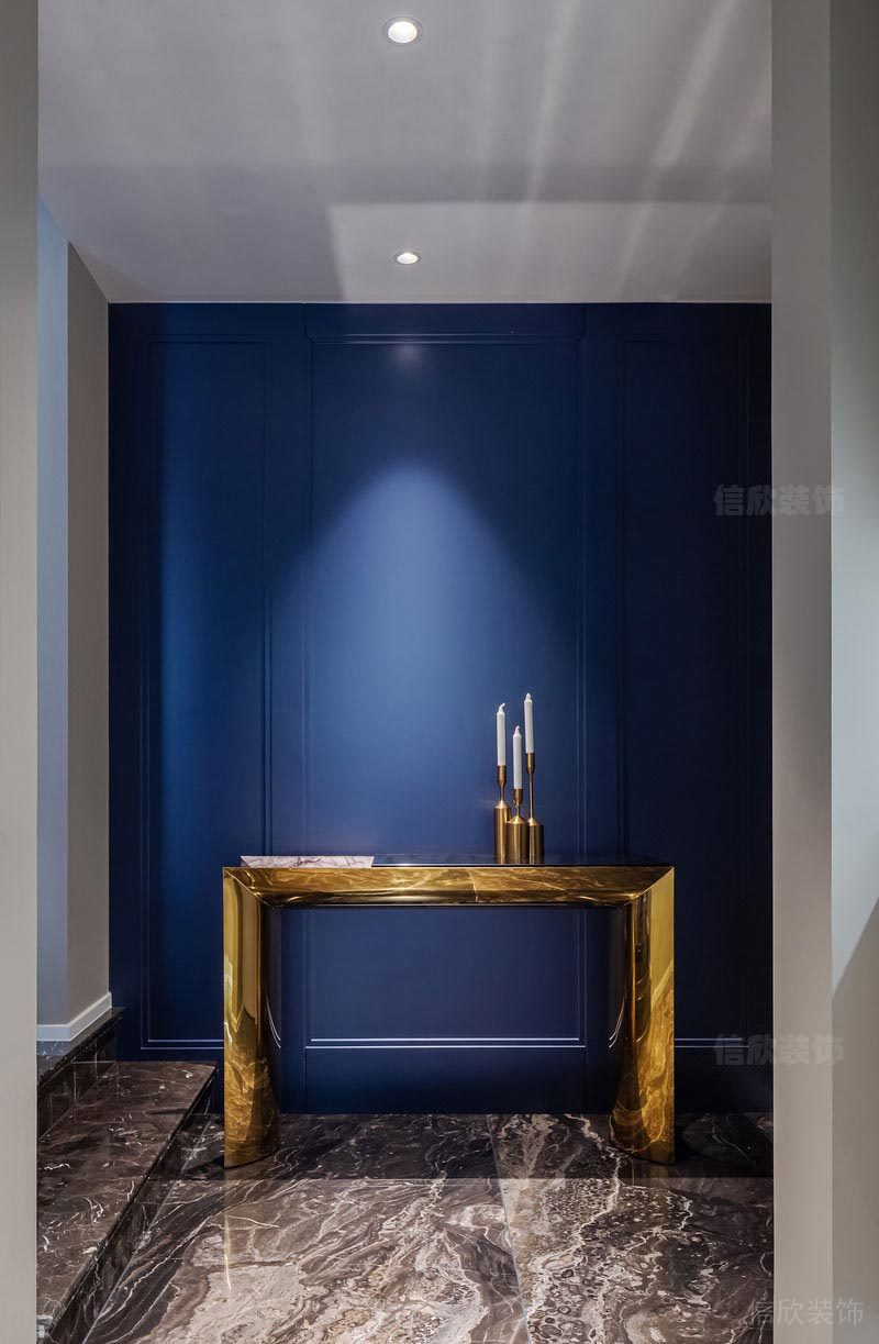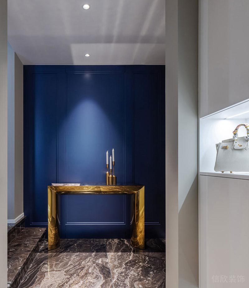 本案的玄關(guān),選用杏色的壁紙作為墻面的基調(diào),配上歐美貴族式的藍色在背景墻色調(diào),金色金屬和天然石材的玄關(guān)柜把奢華感拉到了極致。