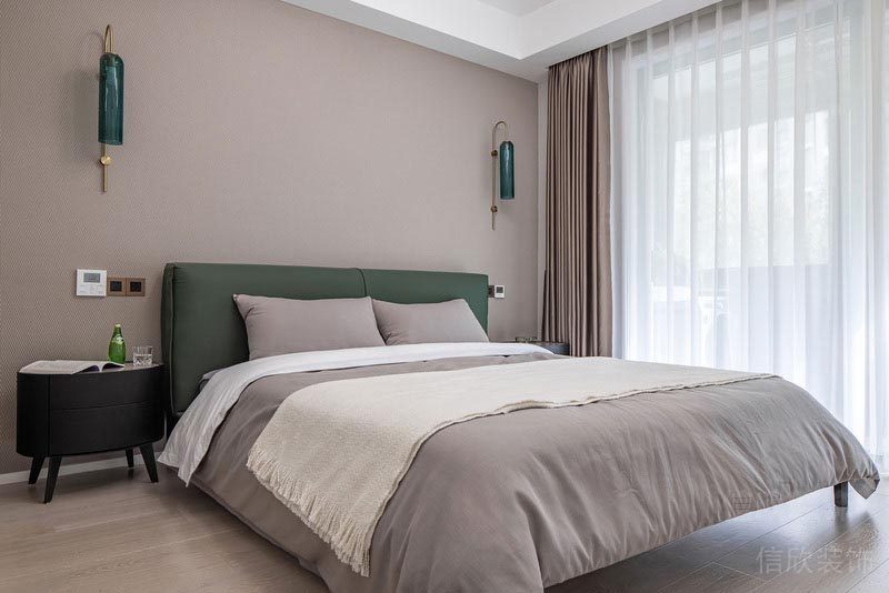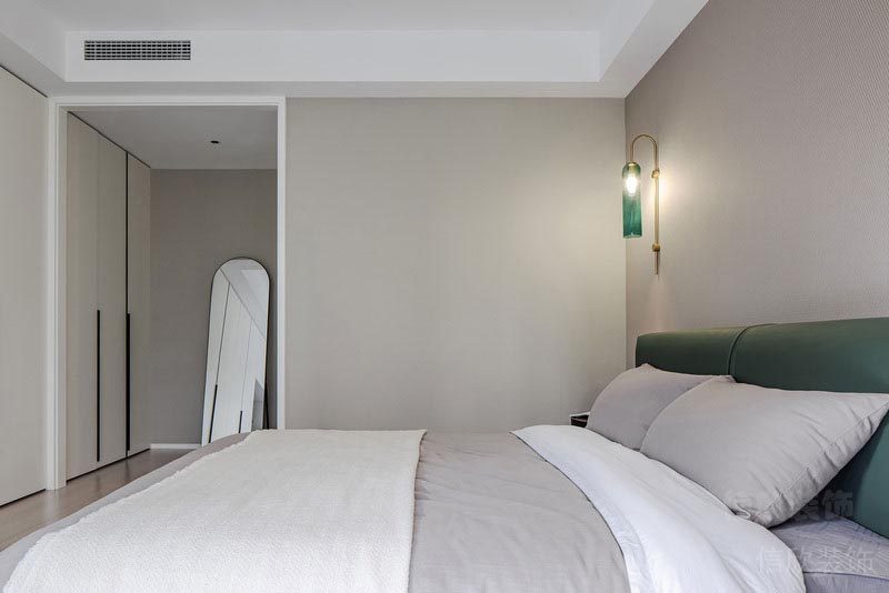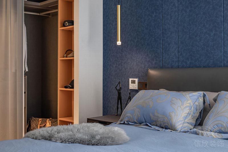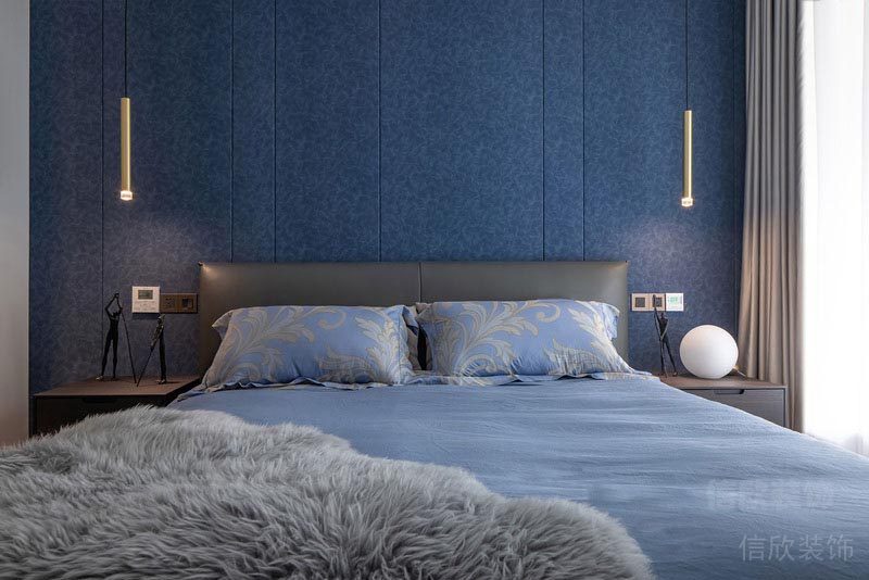 主臥室的設(shè)計采用了皮藝的床,和藍色斑點的硬包背景墻,配上代表輕奢風(fēng)的金屬長管式吊燈,協(xié)調(diào),溫馨中多了一份與眾不同的氣質(zhì)。