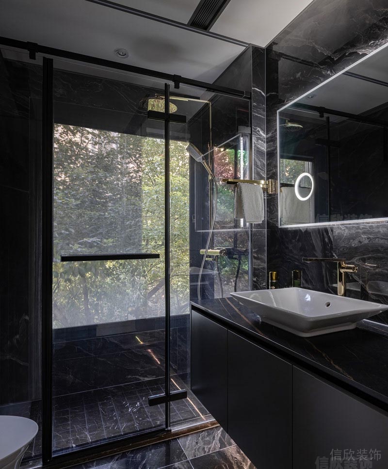 黑色紋理的墻地磚,同樣黑色的浴室柜,加玻璃做了干濕分離的衛(wèi)生間設(shè)計,在功能性的區(qū)分上達到了合理方便的原則,深色的大面積的應(yīng)用則體現(xiàn)出獨特霸氣的歐式輕奢風(fēng)特點。