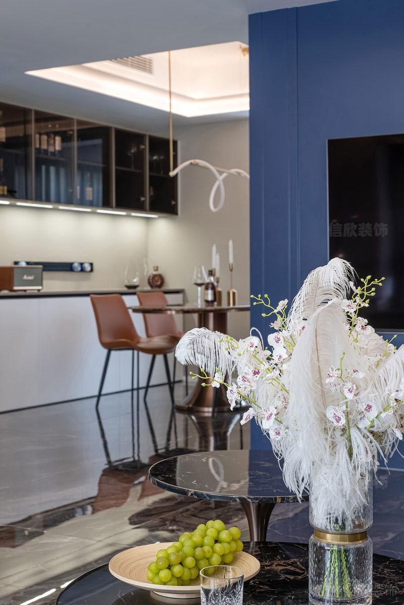 客廳藍色的背景墻,三角形帶量的吊頂,深咖色石紋地磚,專屬于貴族氣質(zhì)的天鵝絨布藝沙發(fā);無一不散發(fā)出瀟灑又桀驁的歐洲古典貴族氣質(zhì)。