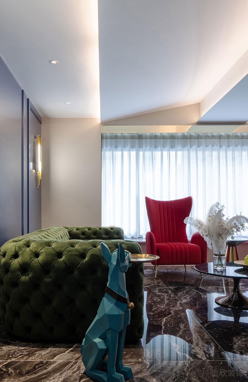 綠色沙發(fā)代表著希望,紅色的沙發(fā)椅則代表熱情,紅綠搭配的組合;讓人心曠神怡,背景墻藍色的高貴,金色壁燈的貴氣,烘托出整個客廳的浪漫氛圍。