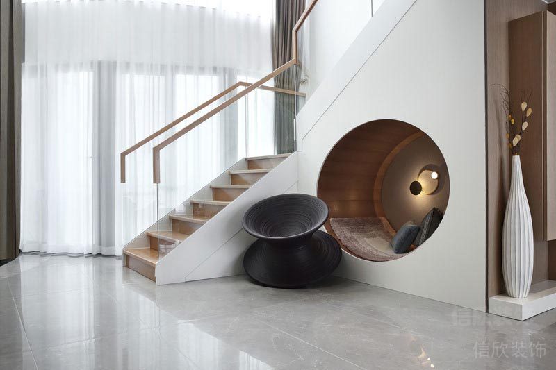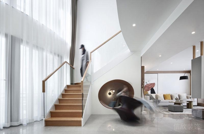 超脫的原木玻璃樓梯,現代感的水晶玻璃吊燈,簡單而脫俗。