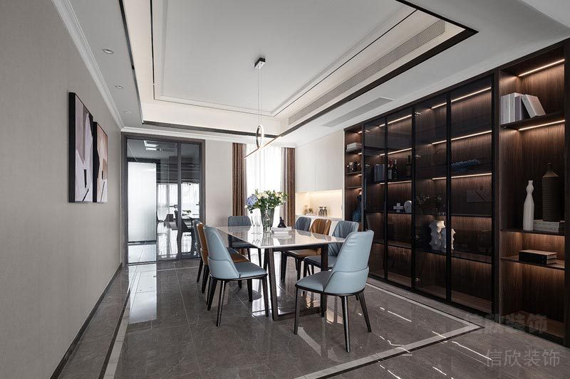 回形的吊頂和地面波打線,顯示出歐式藝術性的對稱美,8人座的石紋黑色不銹鋼腳宴會桌,配上皮藝,明亮通透;白色和黑色玻璃組成的餐邊柜和酒柜,點綴了貴族般的生活享受。