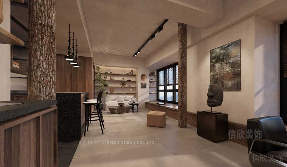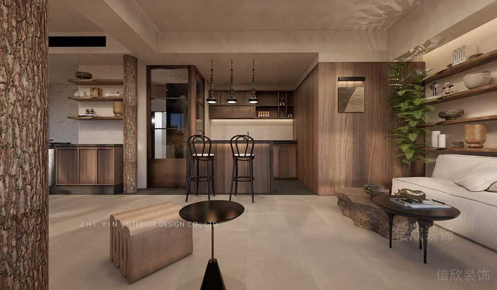 大廳裝修設計,功能分區方式并明顯,整體采用原木風格的設計理念,以極簡的手法,昏黃的顏色,表達出對于傳統的自然的美的理解,可作為一個網紅的打卡景點。