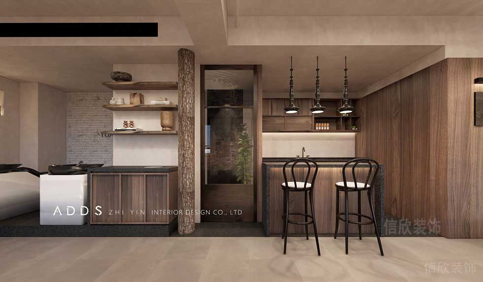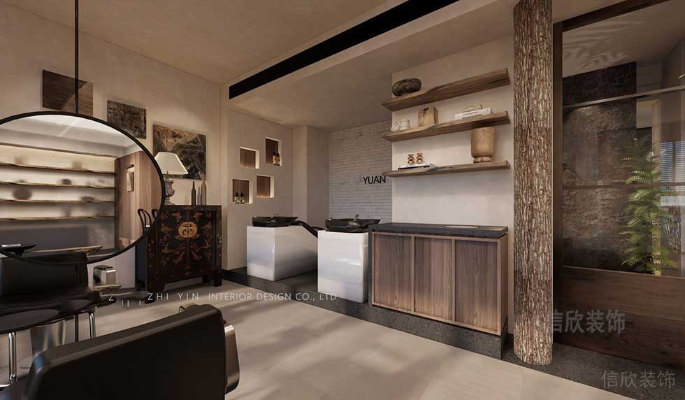 洗頭區設計中會所的盡頭,文化石的背景墻,黑色加高的地臺,實現了功能上的分區,同時也給人一種對過去的歲月和舊時光的懷念之感。