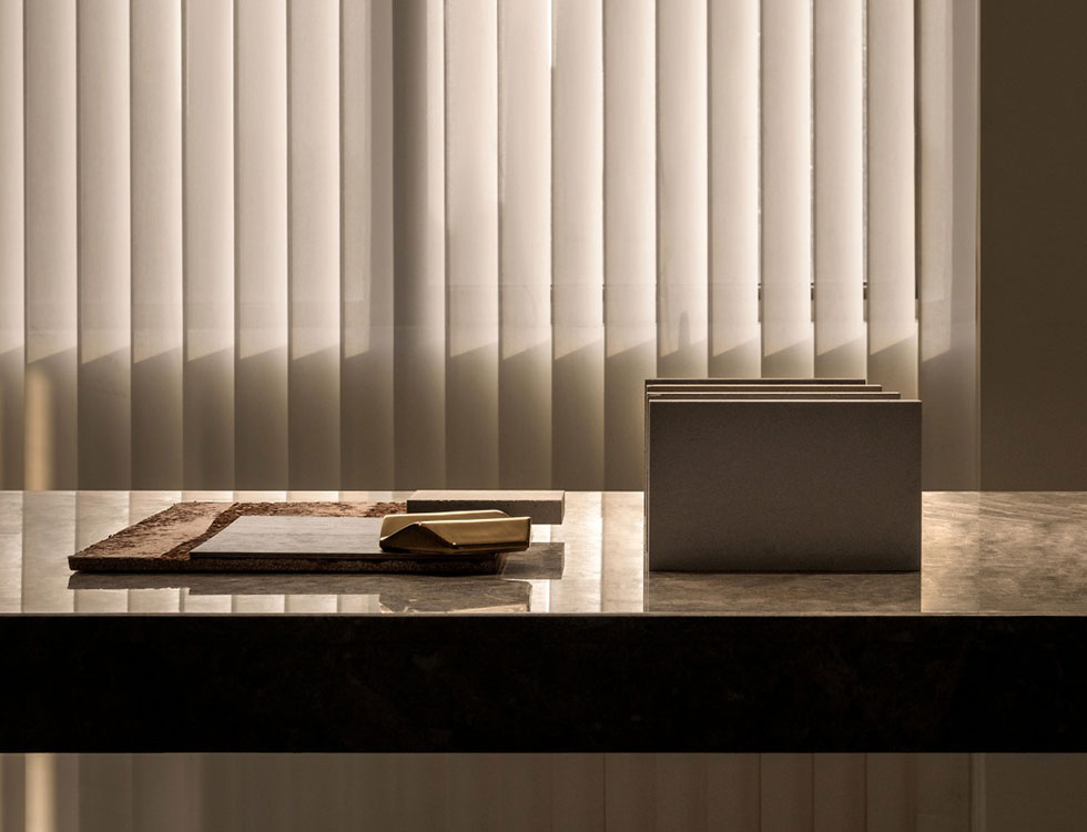 樣的,豎向條窗突破了墻面的連續感,與橫向臺面錯綜,相輔相成。透過隱秘的角落,能一窺室內架上的雕塑,給人一種設計美感上的期許。