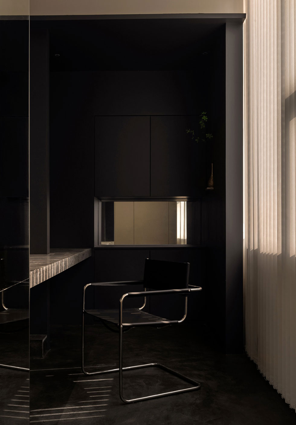 在精巧的小空間中構置一方天地,需要一種縱橫交錯的構成設計。不銹鋼板以橫向構造臺面,垂直的軸線上,布置了專屬的玻璃盆景架,燈具如毛筆豎畫的懸針垂露,在墻面上勾出立體的空間。