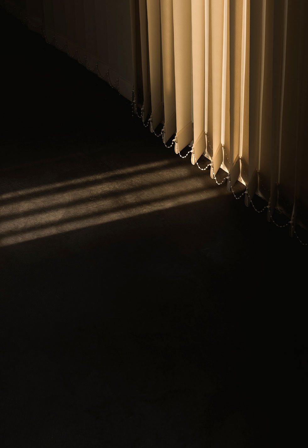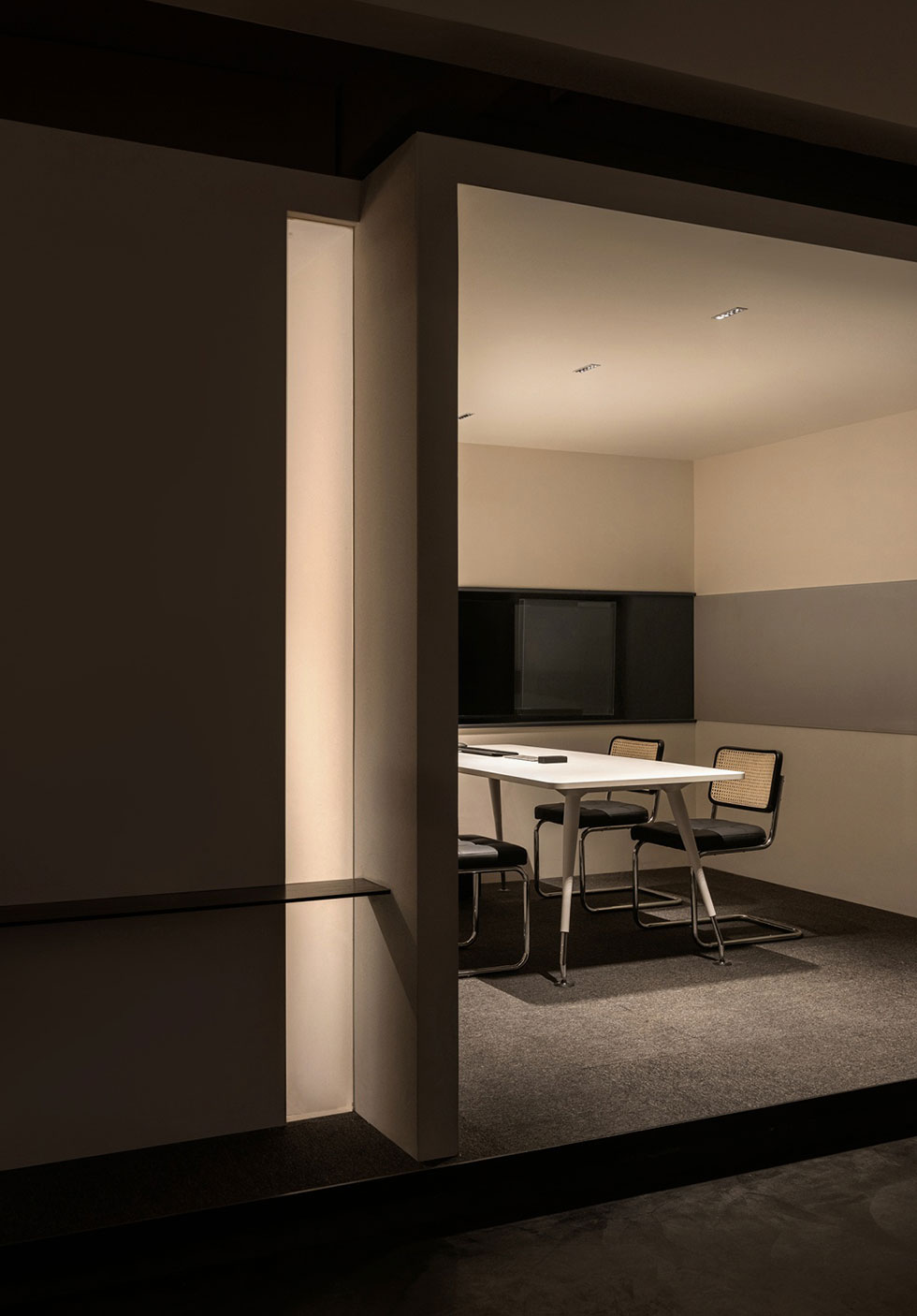 在適當的位置開口引光入室,配合人造的光源,在地面上留下點點微光層層遞進,頂上燈條在幽暗中破開一條光亮縫隙,引導前行。