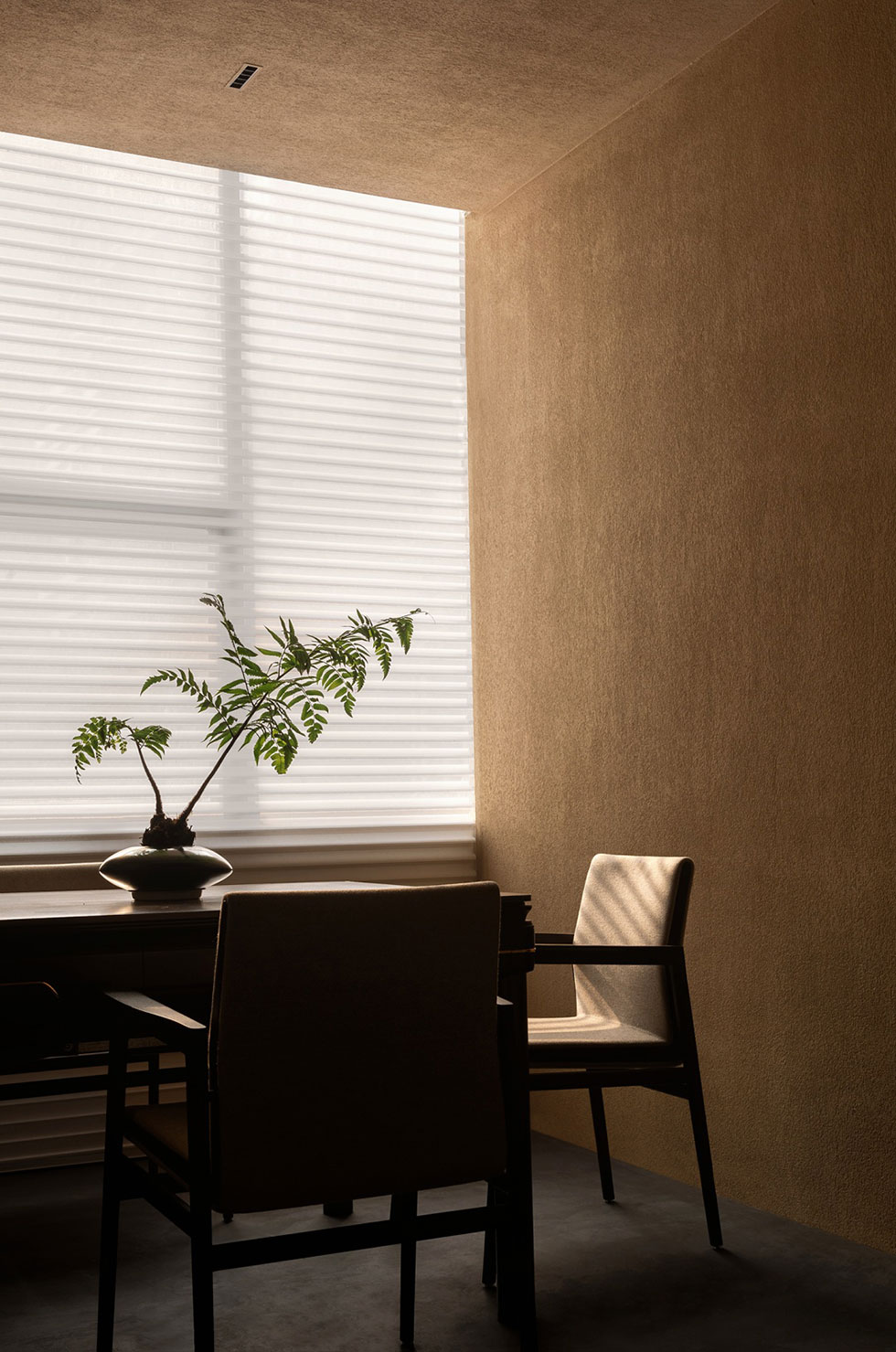 入口幽深,在相對「抑」的氛圍中,屏蔽掉城市喧囂的浮躁。橫向帶窗似隔又透,透露了后續的內部空間,引人入勝。