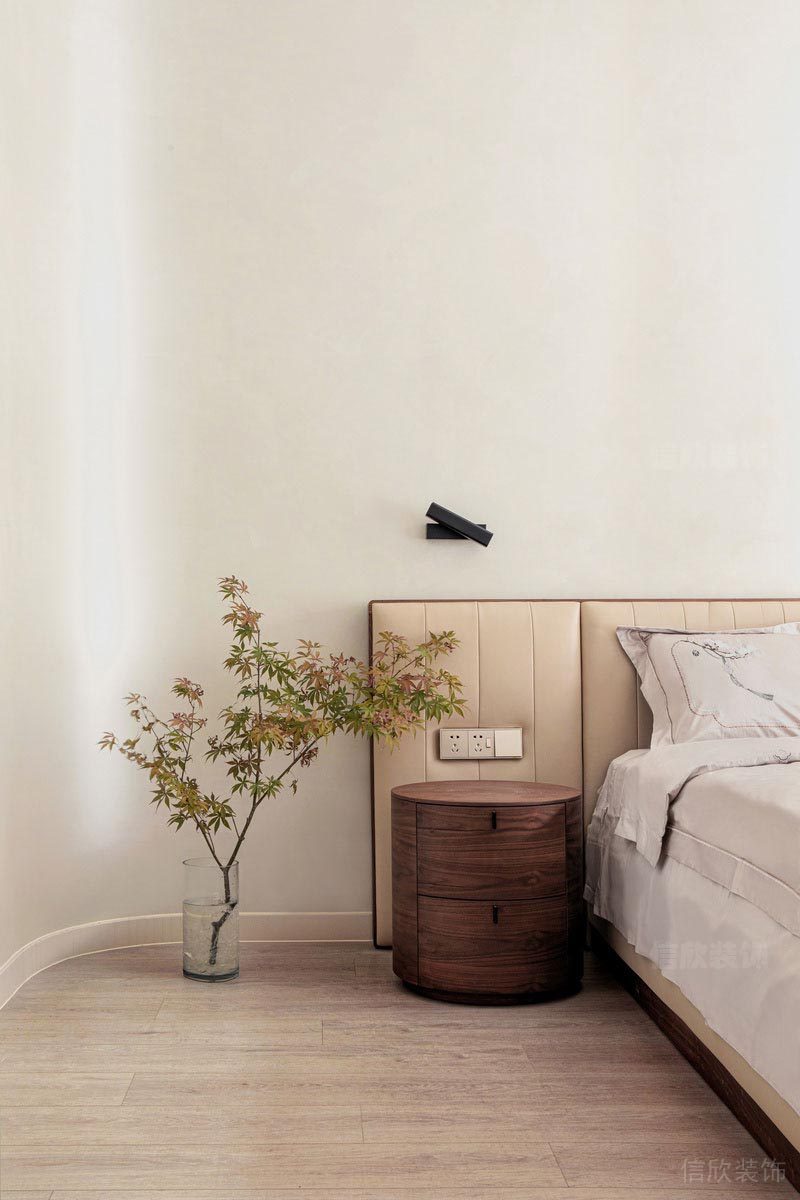 二樓是主臥,整個空間有很多圓弧元素 圓弧床緣、圓潤燈盞、古樸小桌,緩和有序 去掉尖銳的沖突,似主人緩和友好的生活態度 以及東方飾品,傳遞東方優雅大氣 以物會人,感知居者性情與愛好