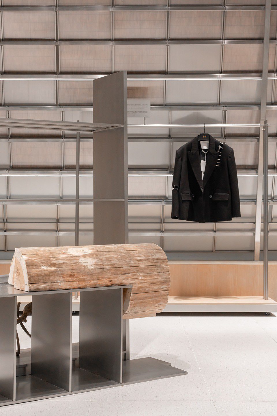 原木風(fēng)服裝店大廳,金屬展架和原木的結(jié)合,衣服掛上去不僅亮眼,也更符合綠色,自然,環(huán)保的理念。