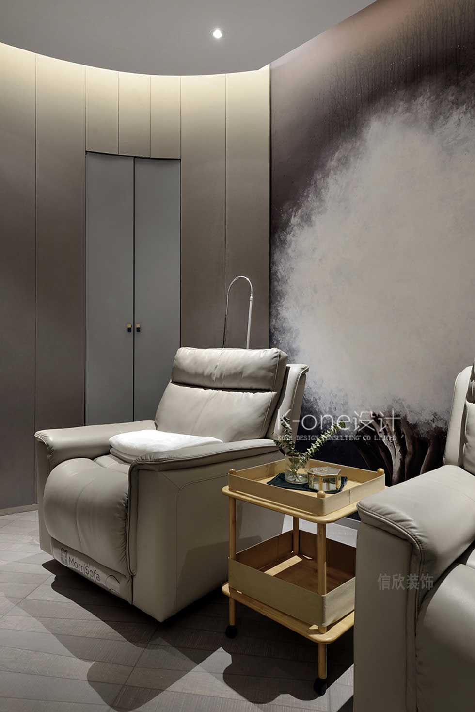 抽拉式如手風琴的沙發座椅,給人的感覺新穎獨特,坐在這里做美甲本身就是一種精致和高雅的生活方式,背后分層式的半圓弧展柜,方便客戶挑選喜歡的顏色,也是一個溫馨的展區。