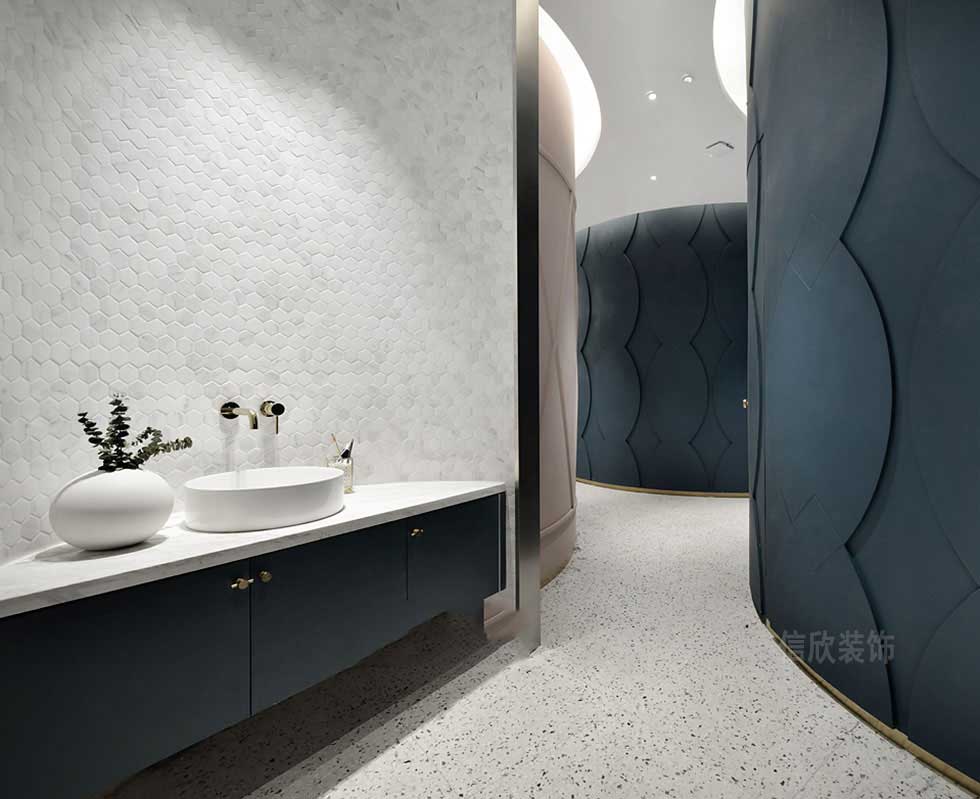 大體的裝修設計,以圓形的造型為基礎,通過代表輕奢的深綠和粉色兩種顏色對比,墻面不同的紋理,以及頂面的半圓弧線條感燈膜的頂面,看上去設計新穎,理念獨特具有格調感。