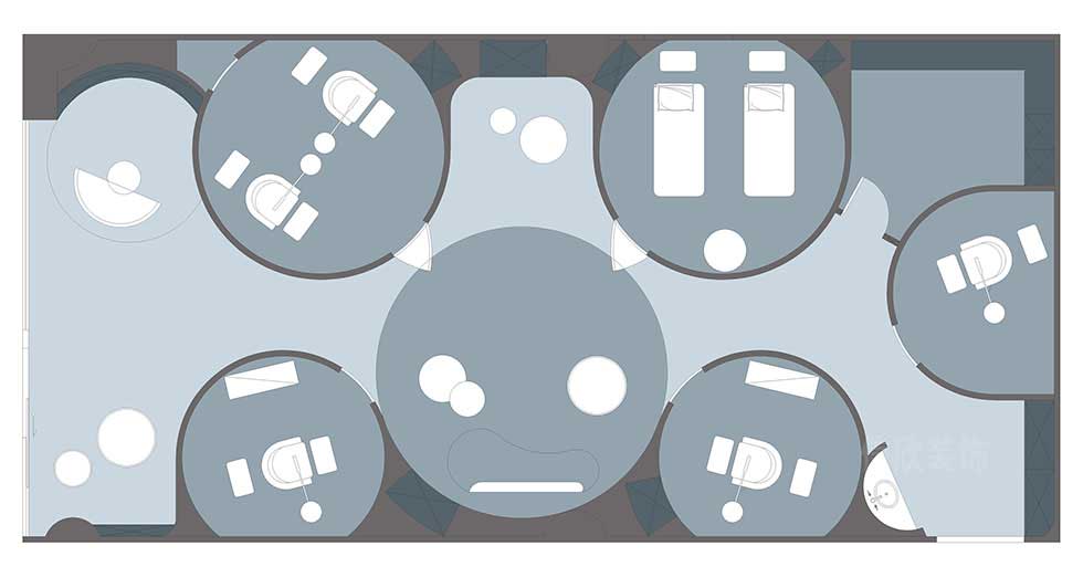 圓形和墻體和頂面結合統一性和和諧感強烈,利用頂面的線條感和黑色的地毯,做了區分的一個區分,同時代培金屬的茶幾和擺件,給客戶一種輕裝修重奢華的體驗感。