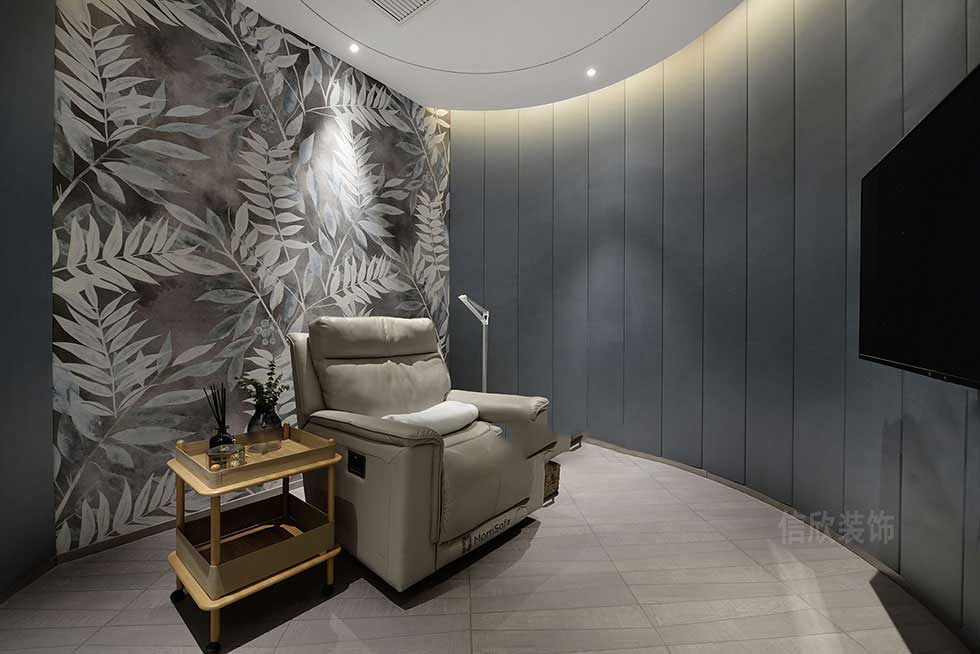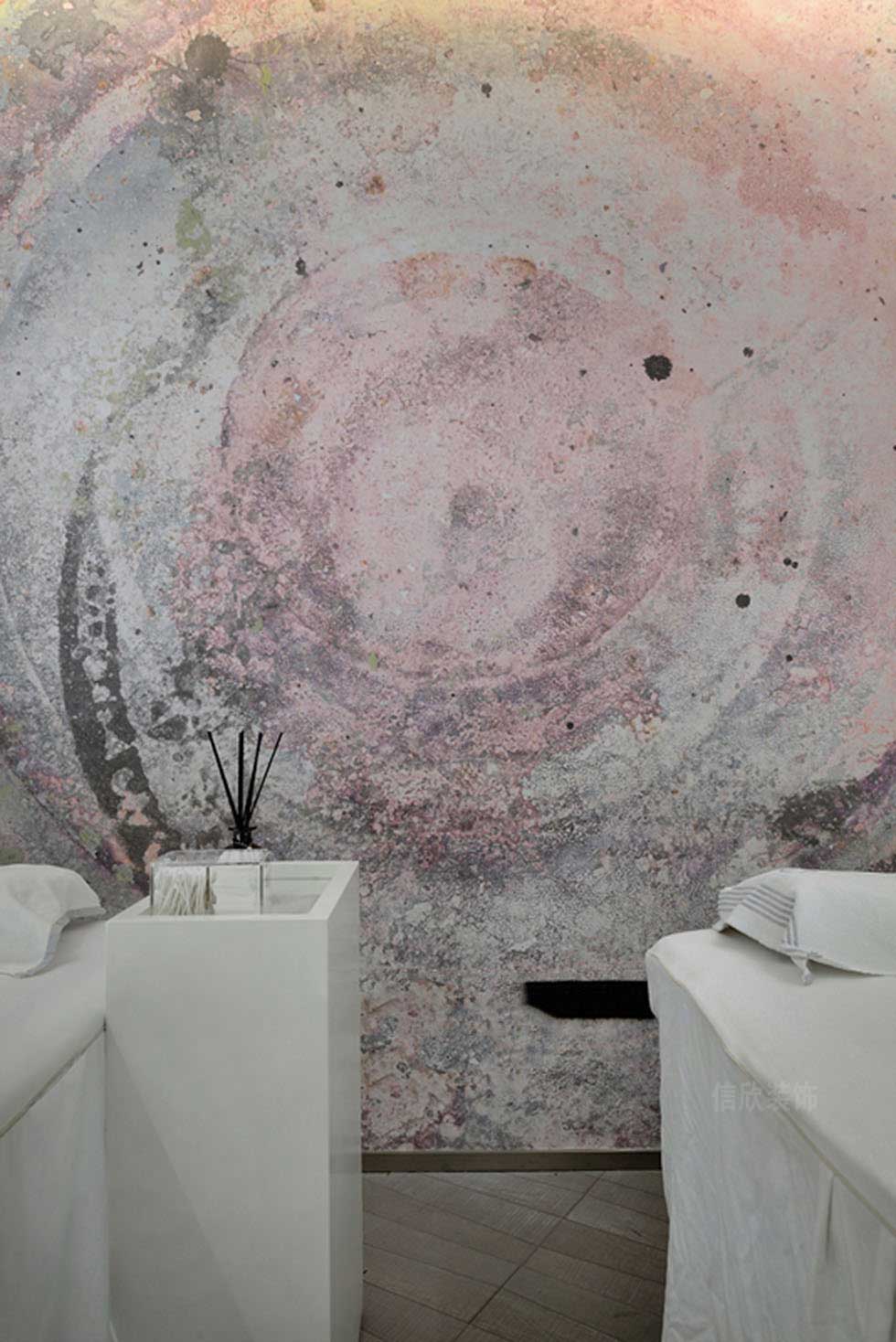 灰色的場景,搭配整面墻體做成的印象派風格的抽象畫,極具個性的錯拼式地板,讓人一進來就能感受到用心和藝術感的氛圍,雙人床的設計,可以約上閨蜜好友一起來做美容,邊體驗邊聊天,可以讓時間過的很快,而且輕松有趣。