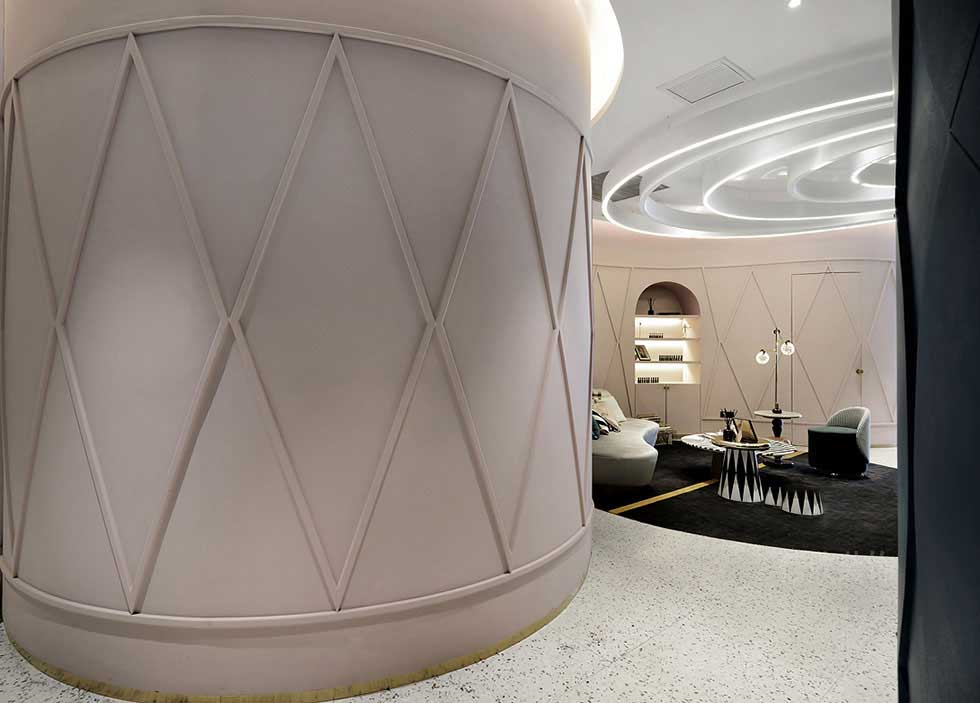 設計理念:流動的粉色空間,加入那抹藍色,兩組不同的色彩、自由的圖形、不同形態的碰撞,生成當代審美的代名詞——華麗的優雅!