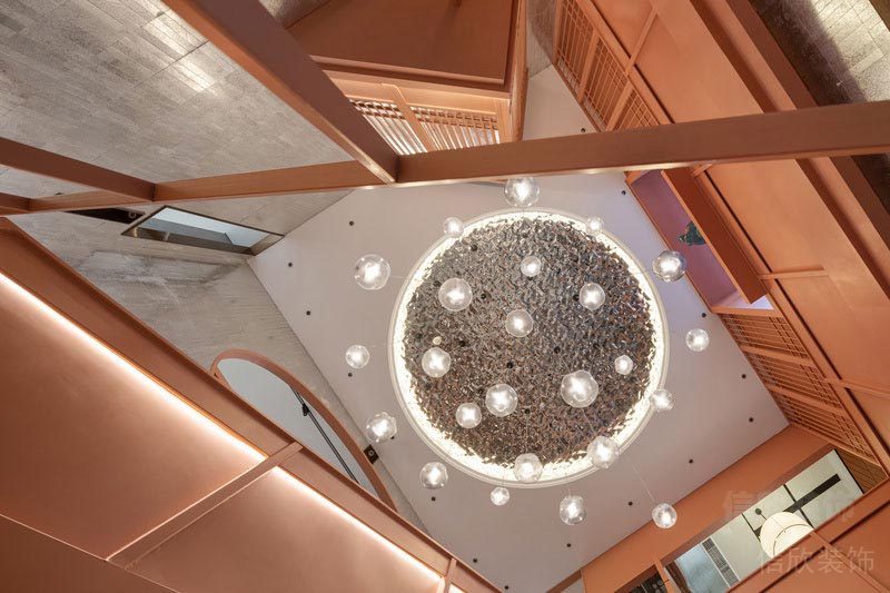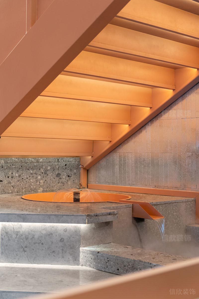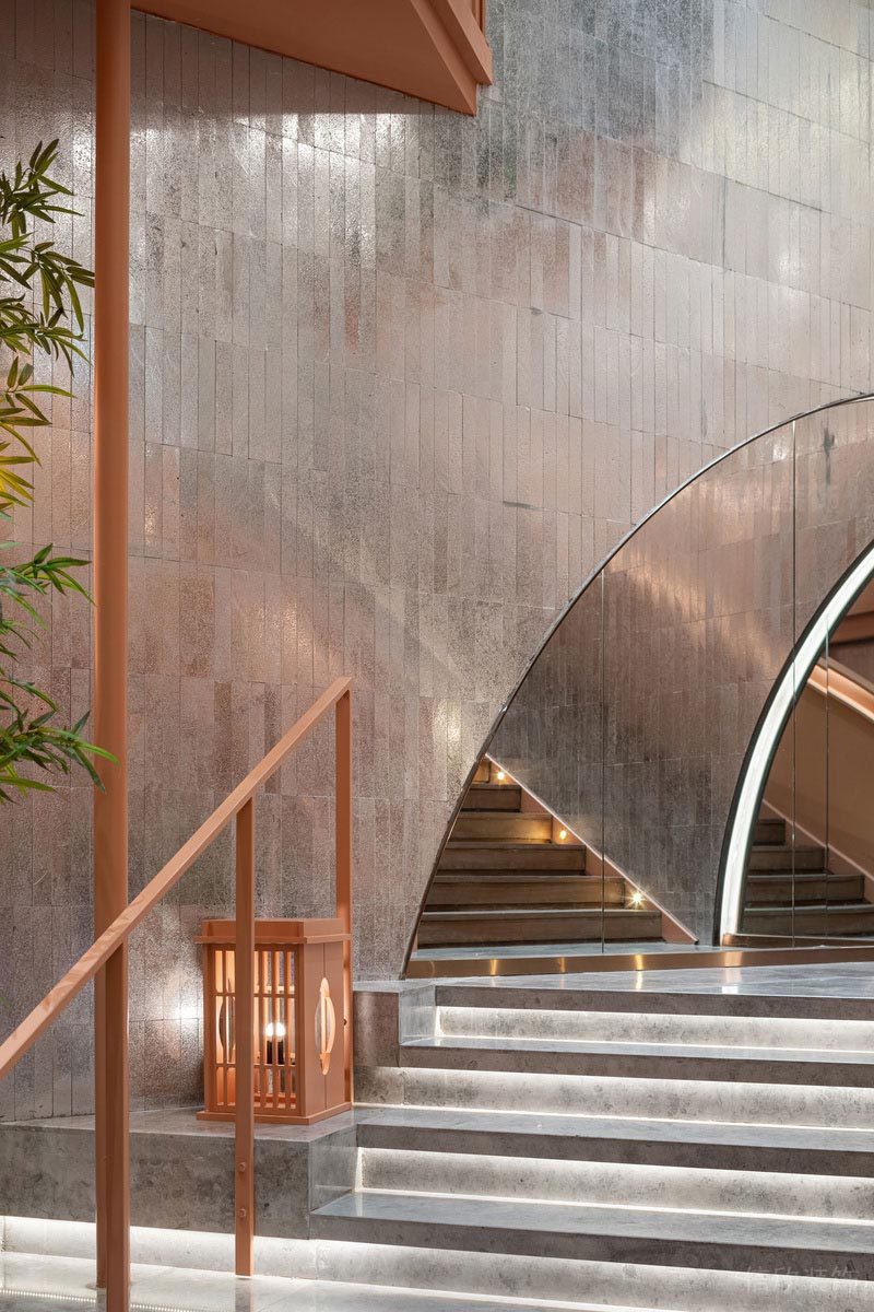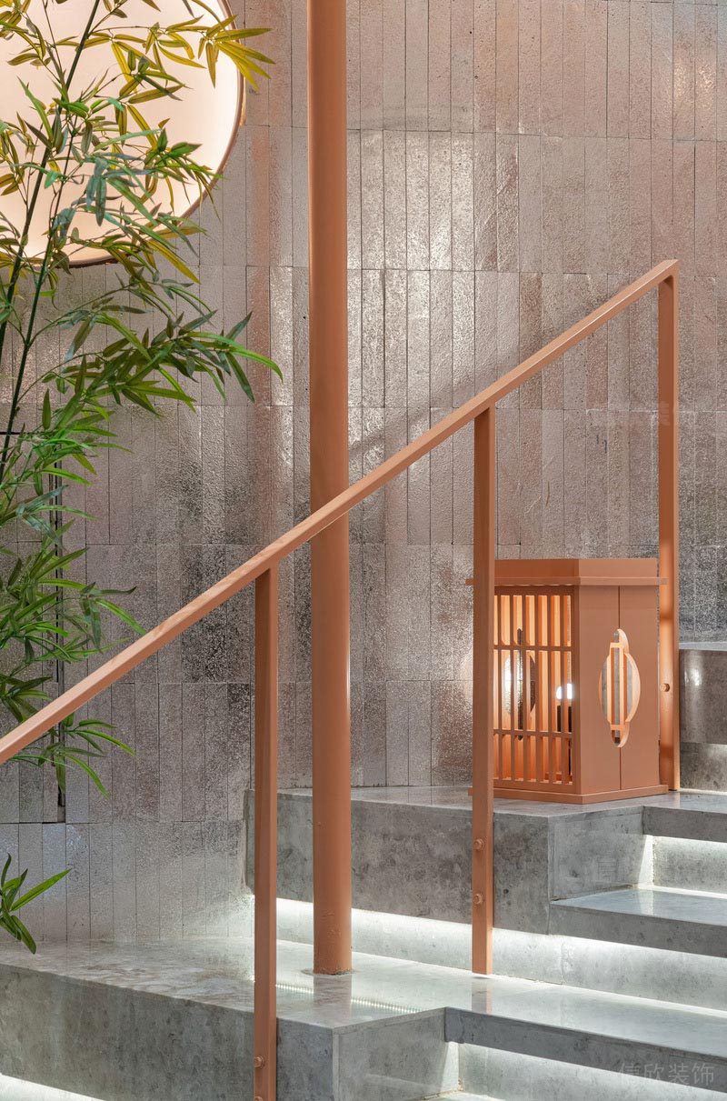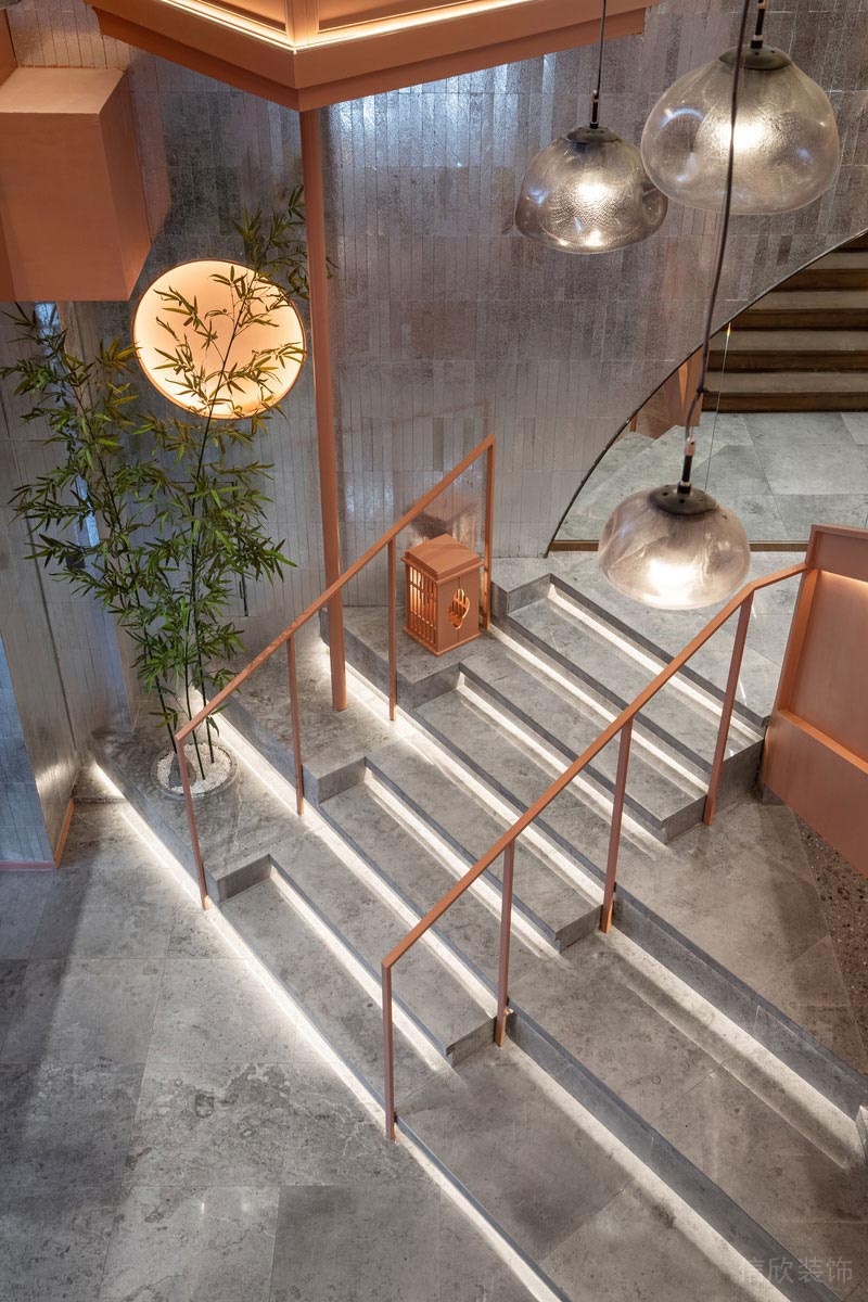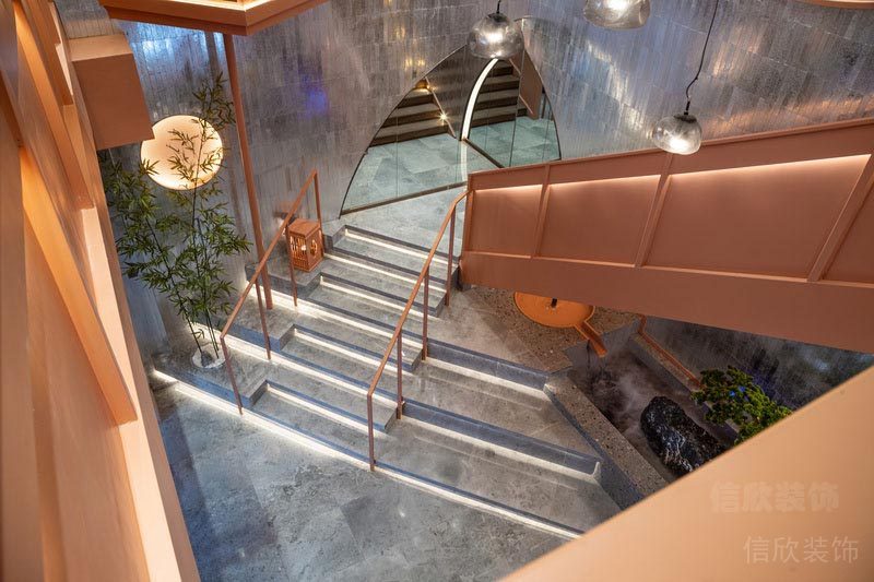 深圳市龍崗區中餐廳樓梯 灰色的樓梯,在燈帶的裝點下,如山澗溪流在緩緩流淌,君子之風的瘦骨竹,在一輪明月的照耀下,如一副潑墨寫意的山水畫。