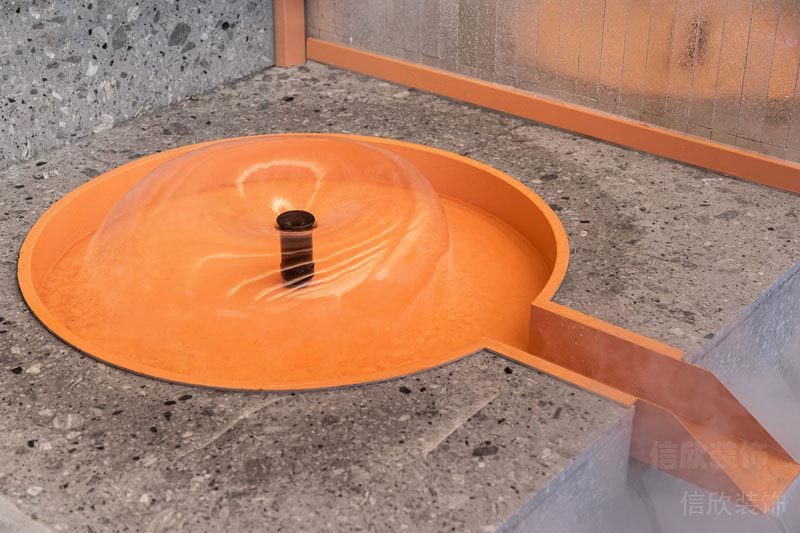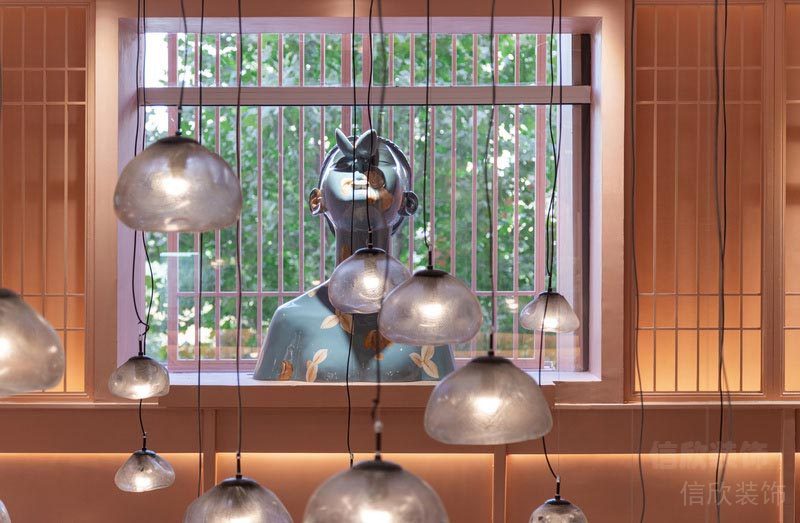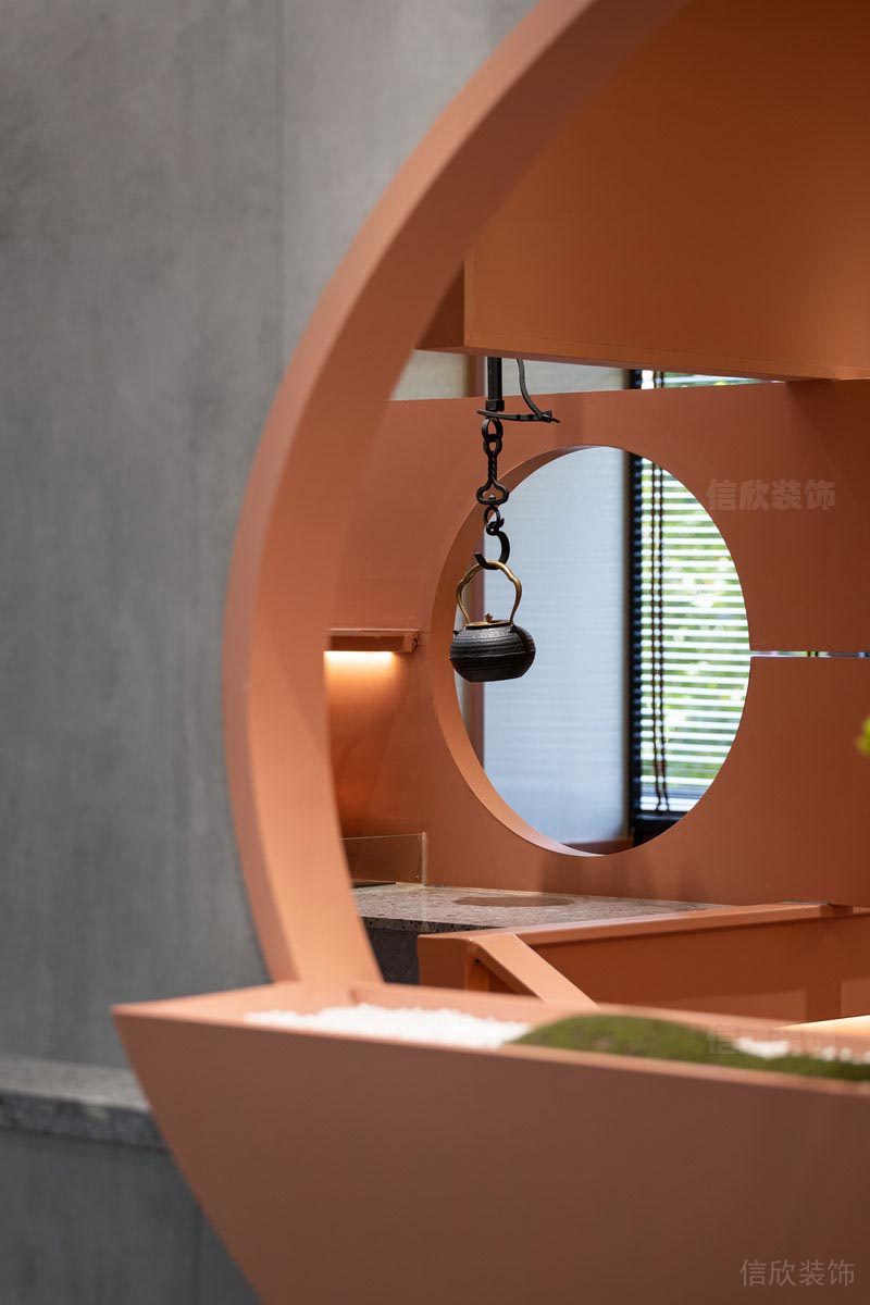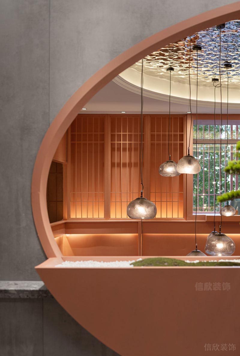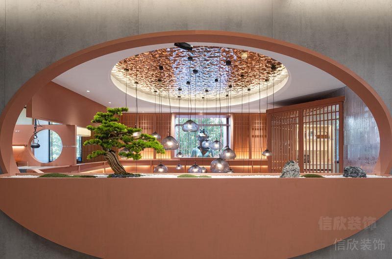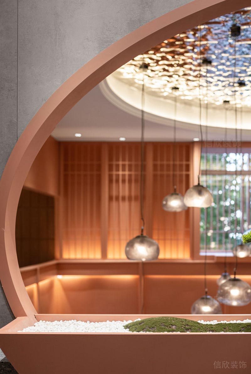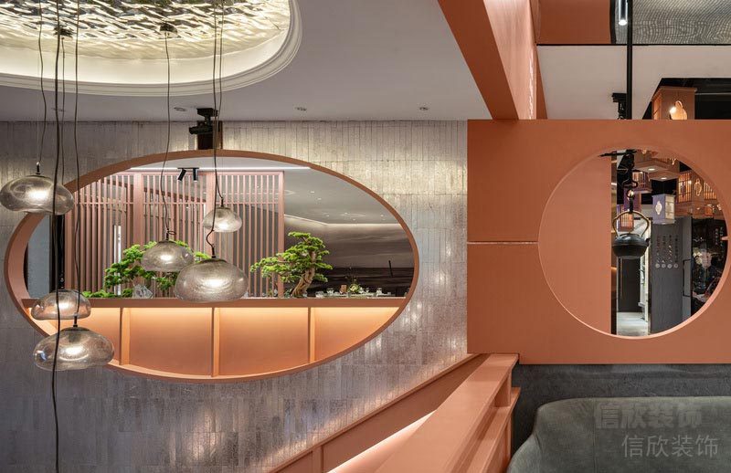 深圳市龍崗區中餐廳景觀 墻面上開了圓孔的隔墻,暗合天圓地方之意,開闊了視野,可以把陽光引進來,枯山水的綠植用餐之余,也是一道養眼的綠意。