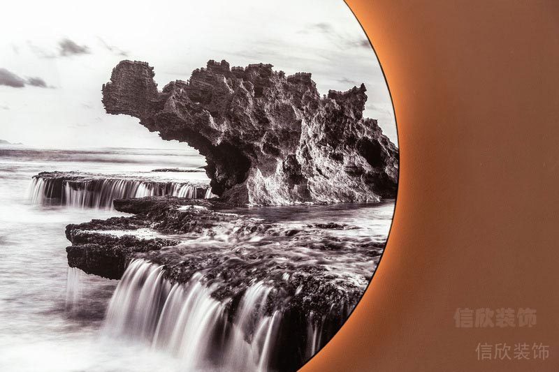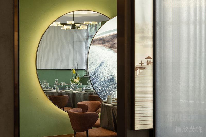 深圳市龍崗區中餐廳背景墻 明月般的墻飾,鏡子和風景畫的結合,似乎告訴人們,人有悲歡離合,月有陰晴圓缺,此事古難全,活在當下,珍惜此時此刻的相聚時光。