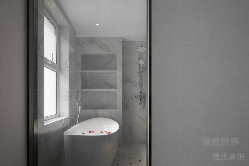 浴缸區(qū)與主臥墻面打通,使用電鍍霧化玻璃, 繼續(xù)放大延展主臥的空間感, 既能看到花瓣灑落弧形浴缸的優(yōu)雅, 又能保證私密性, 為平淡生活增加更多情趣。