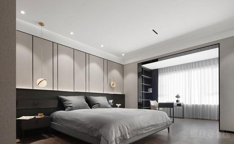 主臥室與陽臺(tái)通透延伸,直通湖景, 陽臺(tái)巧妙設(shè)計(jì)成書房區(qū)域, 靜謐沉穩(wěn),盡享私人湖光。 整體風(fēng)格,簡(jiǎn)約不失優(yōu)雅與格調(diào)。