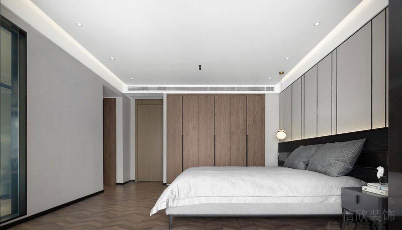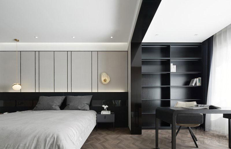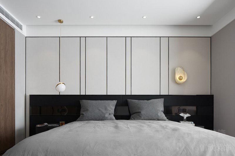 平頂懸浮與進(jìn)口射燈代替?zhèn)鹘y(tǒng)吊頂與吊燈, 床頭保持統(tǒng)一性與結(jié)構(gòu)美, 內(nèi)置交叉手工編織皮質(zhì)包裹, 搭配不對(duì)稱設(shè)計(jì)燈飾, 既能體現(xiàn)空間的整體連貫,又打破呆板。