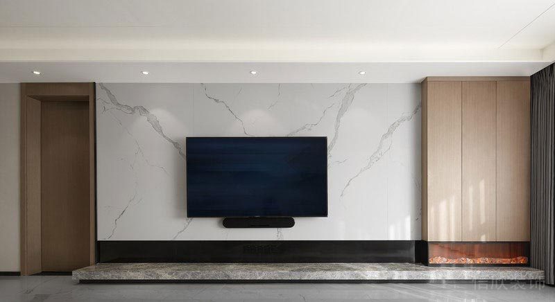 影視墻儲(chǔ)物柜與左側(cè)房門顏色統(tǒng)一對(duì)稱, 儲(chǔ)物柜下增設(shè)壁爐調(diào)節(jié)墻面層次。 細(xì)節(jié)處藏納乾坤, 溫暖和煦于雅致間層現(xiàn)。