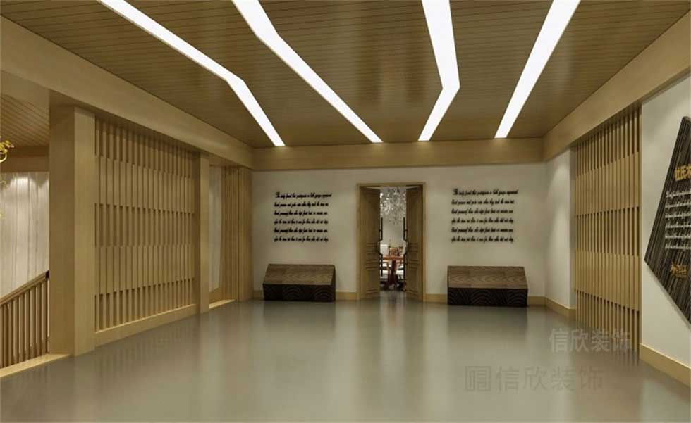 二層延續整體的設計理念,暖黃色的墻面盡顯歲月的沉淀感,墻面和頂面原木一體式的格柵打造,不規則的曲線燈條放置,藝術的線條感裝點了自然的紋理特質。