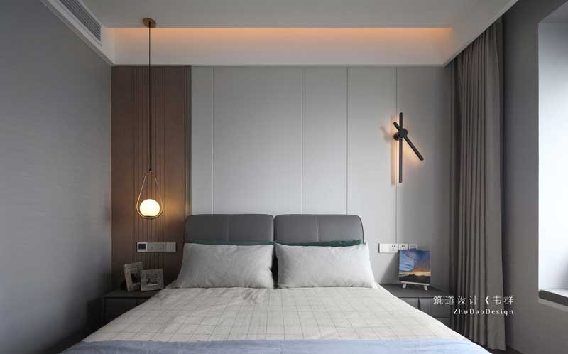 臥室空間選用大量的灰色調,營造空間安靜的氛圍,在寧靜平和的睡眠氛圍中,柔軟的織品更添舒適感,橙色的燈光打破了深色軟式的沉悶,令空間更為平衡。臥室空間選用大量的灰色調,營造空間安靜的氛圍,在寧靜平和的睡眠氛圍中,柔軟的織品更添舒適感,橙色的燈光打破了深色軟式的沉悶,令空間更為平衡。