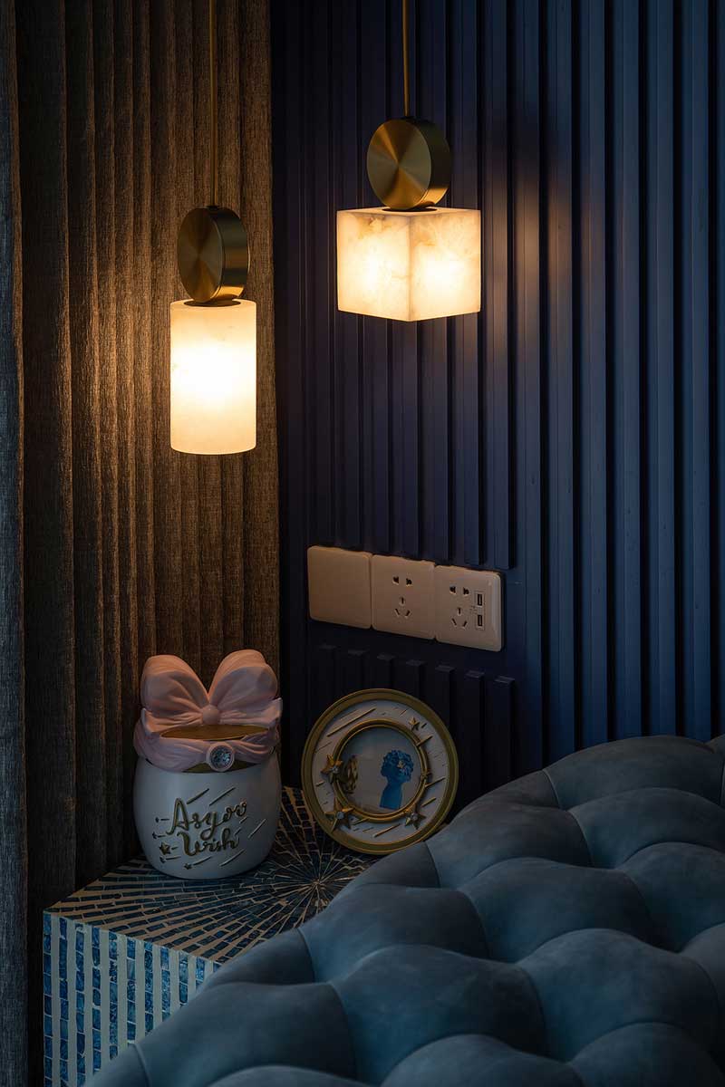 藏藍色的床頭背景墻渲染出法式的精致,對稱的雕花細節點綴空間浪漫優雅的情調,搭配藝術感十足的軟裝擺件,主臥的法式美學意境不言而喻。
