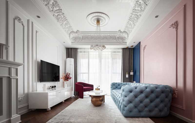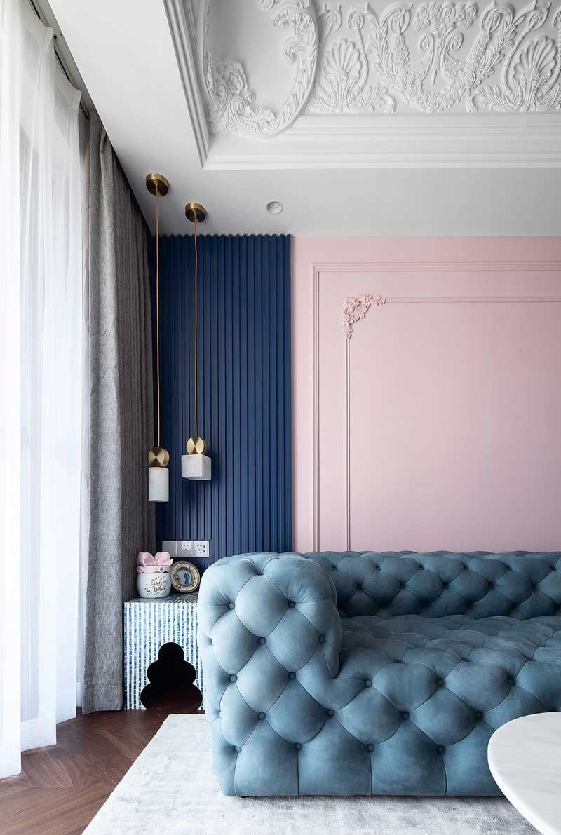 藍色格柵的護墻板,猶如寶石般璀璨的色彩,起到了點睛之筆的妙用,層次分明,立體亮眼,粉色系的背景墻,加上雕花的石膏條設計,用豐富的線條感,來點綴優雅的貴族氣質。