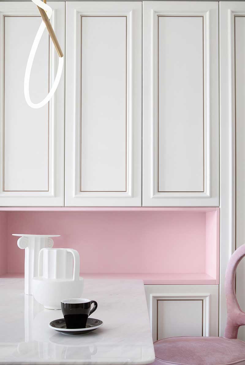 客餐廳一體式的設計,使得空間更具連貫性,不拘一格的設計,讓整個客廳的面積在視覺上更開闊,也更通透,粉色的背景墻和白色的嵌入式柜子,活躍了氣氛,增添了一絲俏皮感。