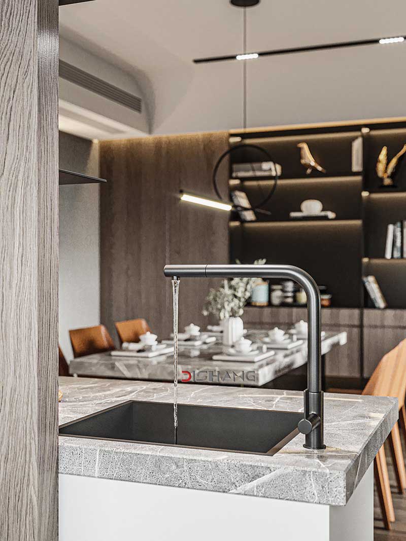 咖色的原木系地板,黑色鋼化玻璃的餐桌,大理石的臺面,在黑色的鐵藝吊燈的光線照射下,把單一品類的自然材料,和手工家具的魅力,與精致生活品質完美的融合在一起,給人以現代輕奢生活的優雅和情調。