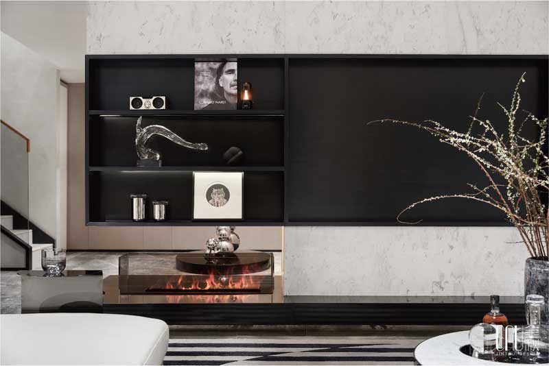 白色石膏線條的頂面,直通式的設計,空間開闊,寬敞大氣,黑色大理石地面,神秘而冷酷,搭配陽臺猶如流水般的地面,仿佛真的在緩緩流淌,黑白分明的理念,詮釋極簡的優雅。