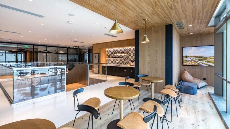 在墻面上大量使用玻璃墻,使空間的通透性強,人們可以通過玻璃看到窗外的世界,使辦公空間與室外自然環境在一定程度上達到相互融合。同時,室內植物在陽光的照射下形成自然的光影,對辦公空間有一定裝飾性。