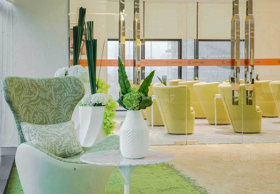 設計理念:隨著健康、原生態的概念越來越受城市人青睞,把原生態概念滲透到美容辦公的體驗中心去。木條子高低錯落,宛如樹的枝葉垂吊在天花上。即為空間分割,也是空間造型與設計初衷的融合。搭配了嫩綠色的家具及植物紋理的地毯,使整個空間貫穿協調統一。
