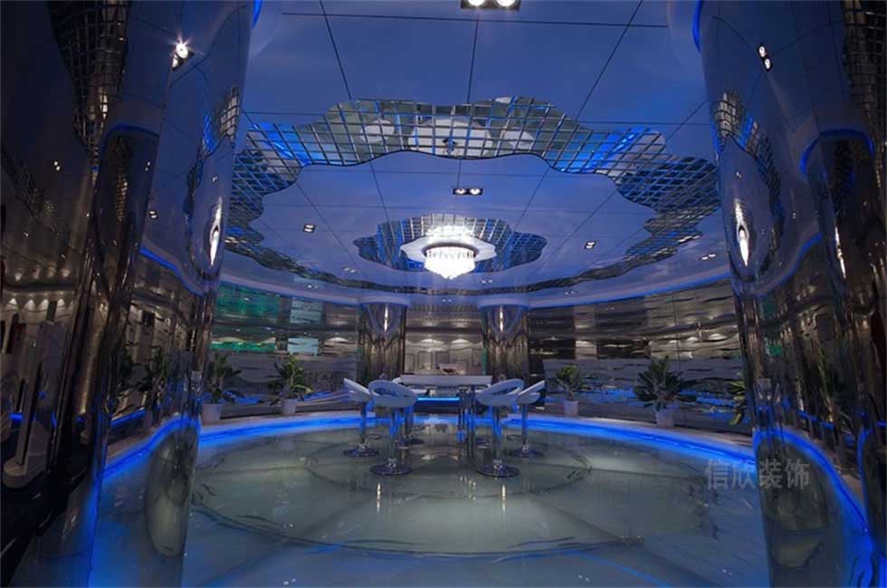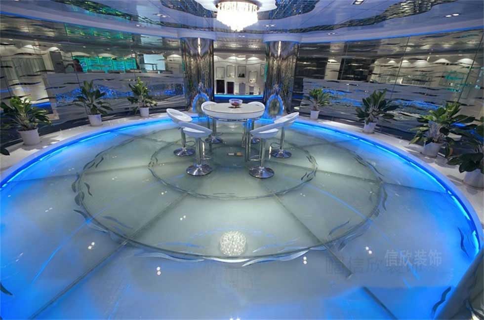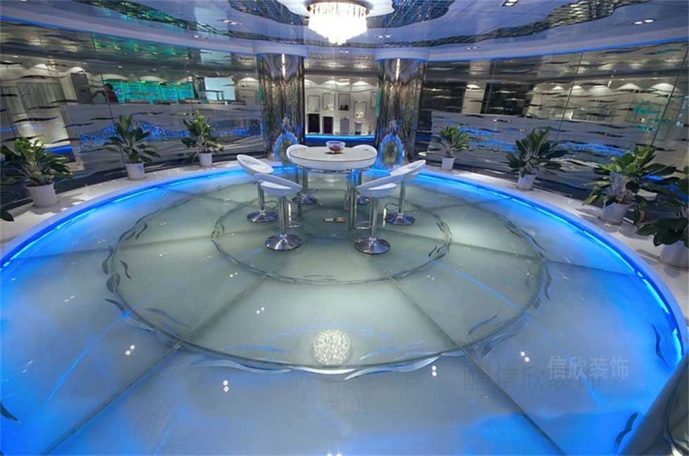 圓形的玻璃房間展區(qū),玻璃的地面在燈光的作用下,泛起微微的藍(lán)色光澤,圓形密封的玻璃外墻,水晶燈主吊燈照射在頂面上,白色圓形的小洽談桌,大圓套小圓的立體設(shè)計(jì)模式,前衛(wèi)現(xiàn)代而且給人一種身處于科幻世界中的體驗(yàn)美感。